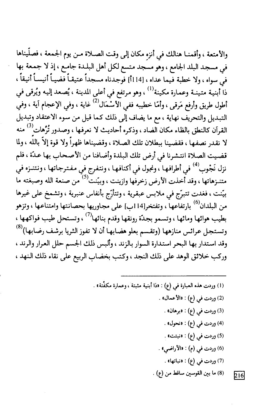 وعمارة مكينة، وهو مرتفع في أعلى المدينة، يُصعد إليه ويُرقى في أطول طريق وأرفع مَرقى، وأمّا خطيبه ففي الأسْمَال غاية، وفي الإعجام آية، وفي التبديل والتحريف نهاية، مع ما يضاف إلى ذلك كما قيل من سوء الاعتقاد وتبديل القرآن كالنطق بالظاء مكان الضاد، وذكره أحاديث لا نعرفها، وصدور تُرَّهاتٍ منه لا نقدر نصفها، فقضينا ببطلان تلك الصلاة، وقضيناها ظهراً ولا قوة إلاّ بالله، ولما قضيت الصلاة انتشرنا في أرض تلك البلدة وأضافنا من الأصحاب بها عدّة، فلم نزل نَجْوب في أطرافها، ونجول في أكنافها، ونتفرج في مفترجاتها، ونتنزه في