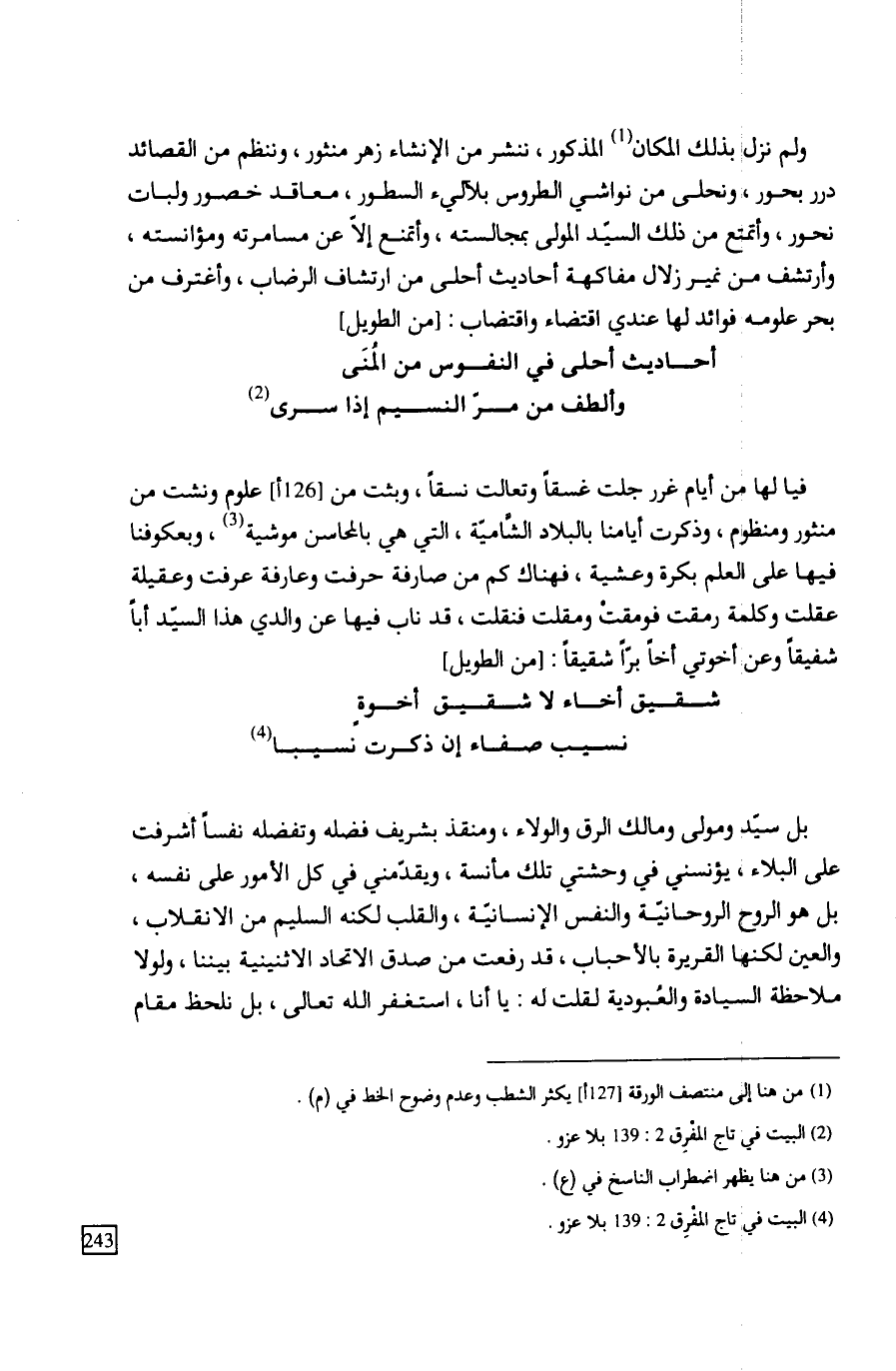 فيا لها من أيام غرر جلت غسقاً وتعالت نسقاً، وبثت من علوم ونشت من منثور ومنظوم، وذكرت أيامنا بالبلاد الشَّاميّة، التي هي بالمحاسن موشية، وبعكوفنا فيها على العلم بكرة وعشية، فهناك كم من صارفة حرفت وعارفة عرفت وعقيلة عقلت وكلمة رمقت فومقتْ ومقلت فنقلت، قد ناب فيها عن والدتي هذا السيد أباً شفيقاً وعن أخوتي أخاً برّاً شقيقاً: