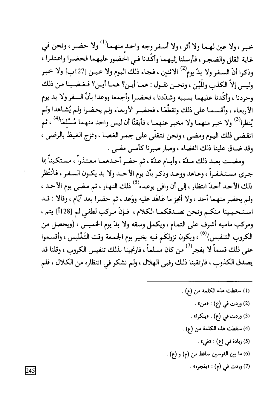 خبر، ولا عين لهما ولا أثر، ولا أسفر وجه واحدٍ منهما ولا حضر، ونحن في غاية القلق والضجر، فأرسلنا إليهما وأكّدنا في الحضور عليهما فحضرا واعتذرا، وذكرا أنّ السفر ولا بدّ يوم الاثنين، فجاء ذلك اليوم ولا عين ولا خبر وليس إلاّ الكذب والمَيْن، ونحن نقول: هما أين؟ هما أين؟ فغضبنا من ذلك وحردنا، وأكّدنا عليهما بسببه وشدّدنا، فحضرا وأجمعا ووعدا بأنّ السفر ولا بد يوم الأربعاء، وأقسما على ذلك وتقطَّعَا، فحضر الأربعاء ولم يحضرا ولم يُشاهدا ولم يُنظرا ولا خبر منهما ولا مخبر عنهما، فأيقنَّا أن ليس واحد منهما مُسْلِمَا، ثم انقضى ذلك اليوم ومضى، ونحن نتقلى على جمر الغضا، ونمزج الغيظ بالرضى، وقد ضاق علينا ذلك الفضاء، وصار صبرنا كأمس مضى.