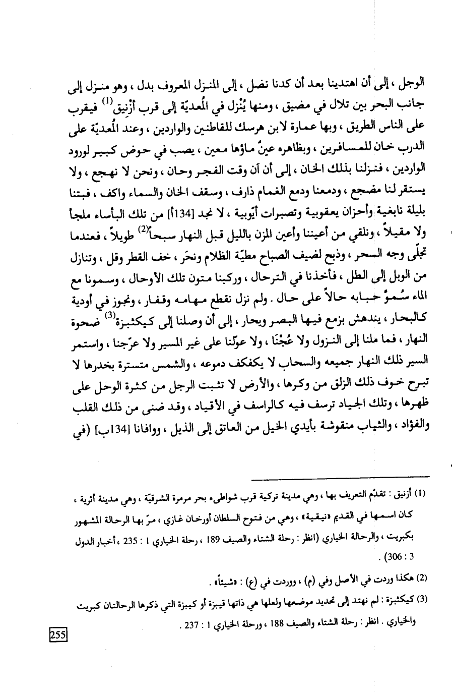 الوجل، إلى أن اهتدينا بعد أن كدنا نضل، إلى المنزل المعروف بدل، وهو منزل إلى جانب البحر بين تلال في مضيق، ومنها يُنْزل في المُعديّة إلى قرب أزْنِيق فيقرب على الناس الطريق، وبها عمارة لابن هرسك للقاطنين والواردين، وعند المُعديّة على الدرب خان للمسافرين، وبظاهره عينٌ ماؤها معين، يصب في حوض كبير لورود الواردين، فنزلنا بذلك الخان، إلى أن آن وقت الفجر وحان، ونحن لا نهجع، ولا يستقر لنا مضجع، ودمعنا ودمع الغمام ذارف، وسقف الخان والسماء واكف، فبتنا بليلة نابغية وأحزان يعقوبية وتصبرات أيّوبية، لا نجد من تلك البأساء ملجأ ولا مقيلاً، ونلقي من أعيننا وأعين المزن بالليل قبل النهار سبحاً طويلاً، فعندما تجلّى وجه السحر، وذبح لضيف الصباح مطيّة الظلام ونحَر، خف القطر وقل، وتنازل من الوبل إلى الطل، فأخذنا في الترحال، وركبنا متون تلك الأوحال، وسمونا مع الماء سُموَّ حبابه حالاً على حال. ولم نزل نقطع مهامة وقفار، ونجوز في أودية كالبحار، يندهش بزمع فيها البصر ويحار، إلى أن وصلنا إلى كيكثبزة ضحوة النهار، فما ملنا إلى النزول ولا عُجْنَا، ولا عولنا على غير المسير ولا عرجنا، واستمر السير ذلك النهار جميعه والسحاب لا يكفكف دموعه، والشمس متسترة بخدرها لا تبرح خوف ذلك الزلق من وكرها، والأرض لا تثبت الرجل من كثرة الوحل على ظهرها، وتلك الجياد ترسف فيه كالراسف في الأقياد، وقد ضنى من ذلك القلب والفؤاد، والثياب منقوشة بأيدي الخيل من العاتق إلى الذيل، ووافانا (في