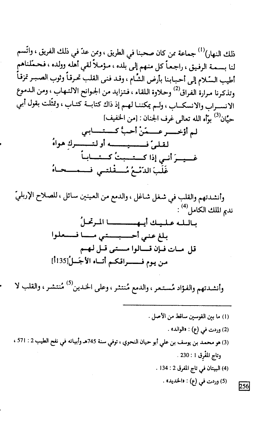 في ذلك الفريق، واتّسم لنا بسمة الرفيق، راجعاً كل منهم إلى بلده، مؤملاً لقي أهله وولده، فحمّلناهم أطيب السلام إلى أحبابنا بأرض الشَّام، وقد فنى القلب تحرقاً وثوب الصبر تمزقاً وتذكرنا مرارة الفراق وحلاوة اللقاء، فتزايد من الجوانح الالتهاب، ومن الدموع الانسراب والانسكاب، ولم يمكننا لهم إذ ذاك كتابة كتاب، وتمثلت بقول أبي حيَّان بوأه الله تعالى غرف الجنان: