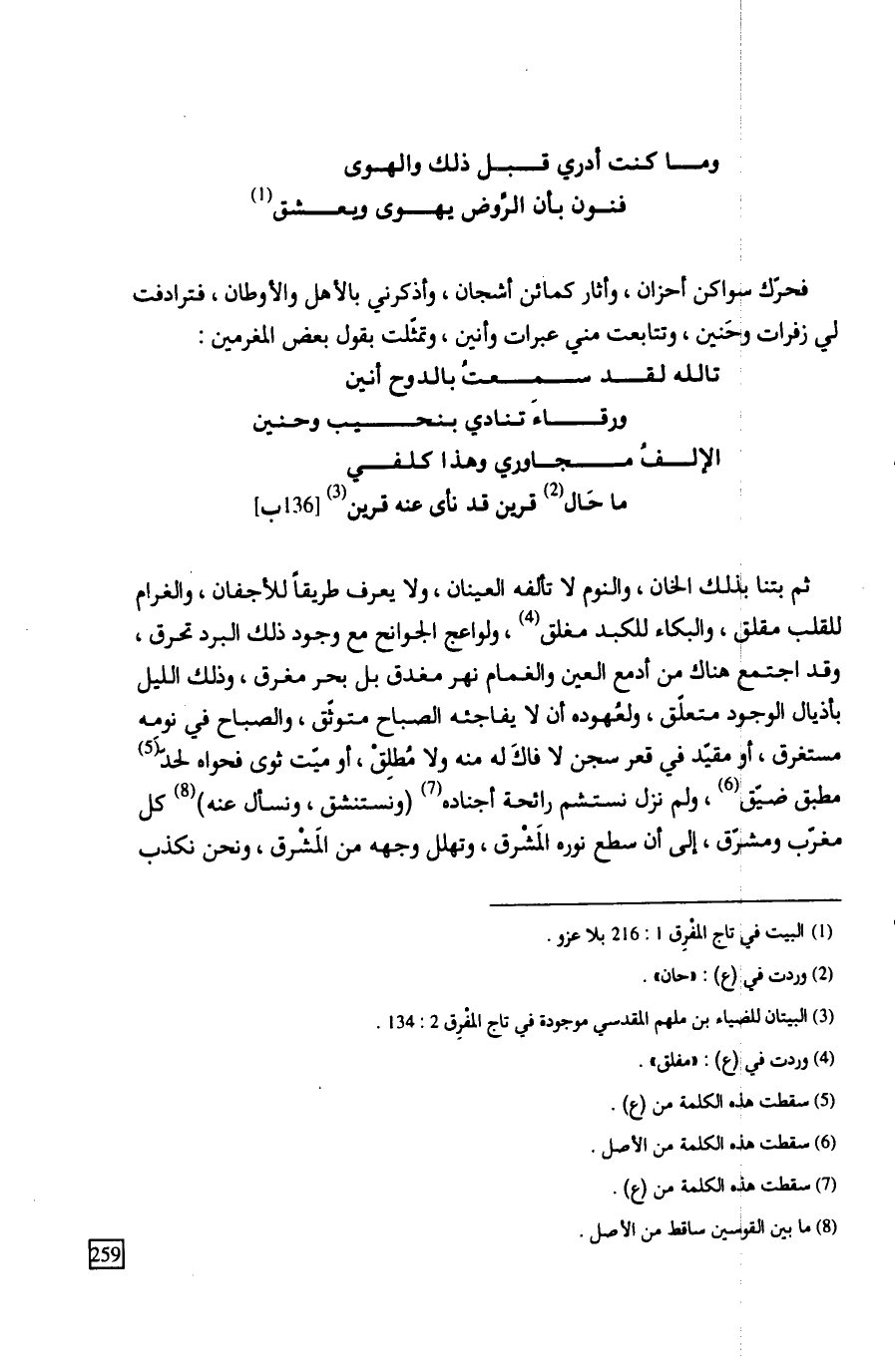 ثم بتنا بذلك الخان، والنوم لا تألفه العينان، ولا يعرف طريقاً للأجفان، والغرام للقلب مقلق، والبكاء للكبد مغلق، ولواعج الجوانح مع وجود ذلك البرد تحرق، وقد اجتمع هناك من أدمع العين والغمام نهر مغدق بل بحر مغرق، وذلك الليل بأذيال الوجود متعلّق، ولعُهوده أن لا يفاجئه الصباح متوثّق، والصباح في نومِه مستغرق، أو مقيد في قعر سجن لا فاكَ له منه ولا مُطلِقْ، أو ميت ثوى فحواه لحدّ مطبق ضيّق، ولم نزل نستشم رائحة أجناده (ونستنشق، ونسأل عنه) كل مغرّب ومشرّق، إلى أن سطع نوره المَشْرق، وتهلل وجهه من المَشْرق، ونحن نكذب