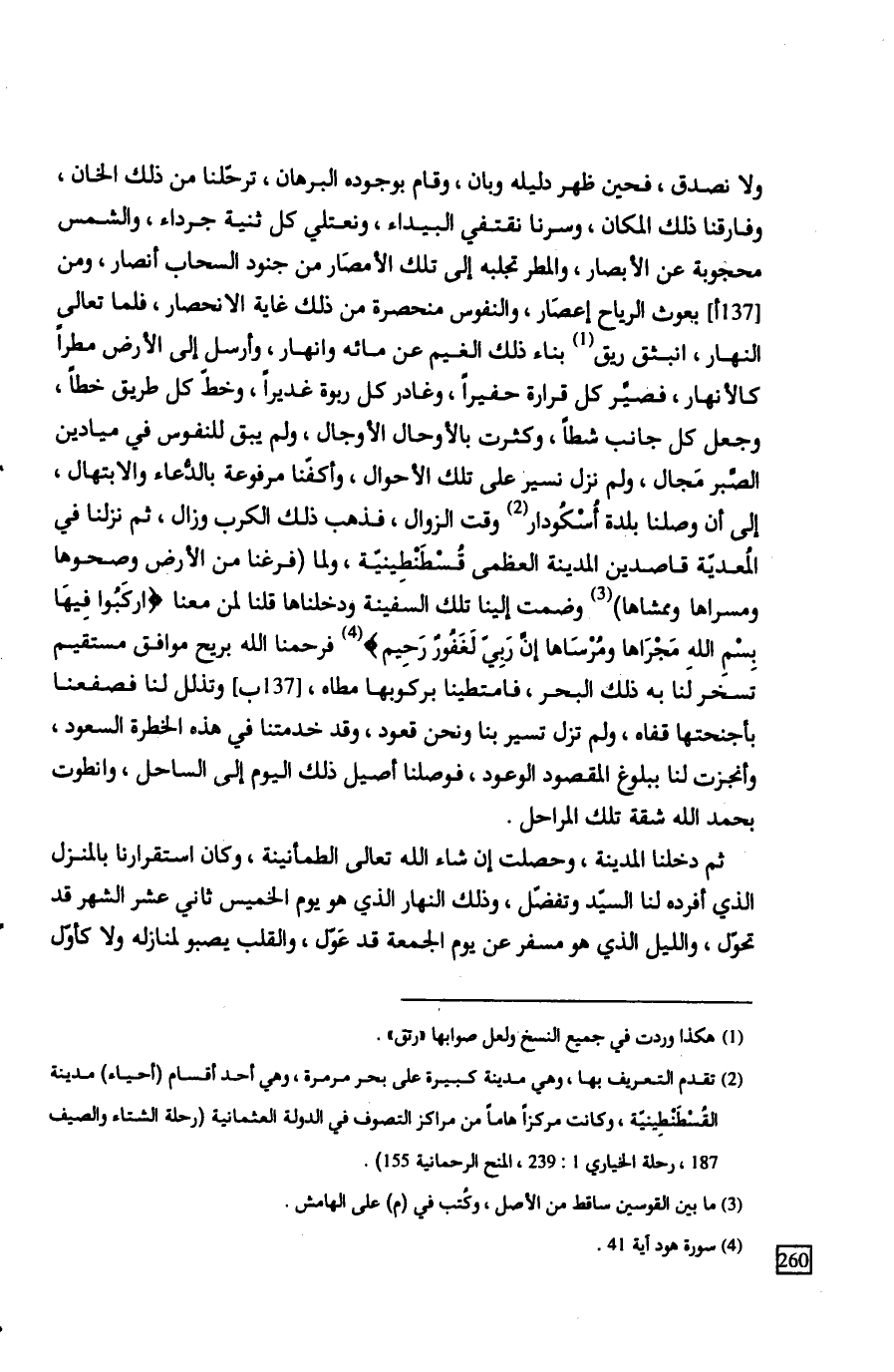 ولا نصدق، فحين ظهر دليله وبان، وقام بوجوده البرهان، ترحلنا من ذلك الخان، وفارقنا ذلك المكان، وسرنا نقتفي البيداء، ونعتلي كل ثنية جرداء، والشمس محجوبة عن الأبصار، والمطر تجلبه إلى تلك الأمصَار من جنود السحاب أنصار، ومن بعوث الرياح إعصَار، والنفوس منحصرة من ذلك غاية الانحصار، فلما تعالى النهار، انبثق ريق بناء ذلك الغيم عن مائه وانهار، وأرسل إلى الأرض مطراً كالأنهار، فصيَّر كل قرارة حفيراً، وغادر كل ربوة غديراً، وخطّ كل طريق خطاً، وجعل كل جانب شطاً، وكثرت بالأوحال الأوجال، ولم يبق للنفوس في ميادين الصَّبر مَجال، ولم نزل نسير على تلك الأحوال، وأكفّنا مرفوعة بالدُّعاء والابتهال، إلى أن وصلنا بلدة أُسْكُودار وقت الزوال، فذهب ذلك الكرب وزال، ثم نزلنا في المُعديّة قاصدين المدينة العظمى قُسْطَنْطِينيّة، ولما (فرغنا من الأرض وصحوها ومسراها وممشاها) وضمت إلينا تلك السفينة ودخلناها قلنا لمن معنا (اركَبُوا فِيهَا بِسْمِ اللهِ مَجْرَاها ومُرْسَاها إنَّ رَبِيّ لَغَفُورٌ رَحِيم (فرحمنا الله بريح موافق مستقيم تسخر لنا به ذلك البحر، فامتطينا بركوبها