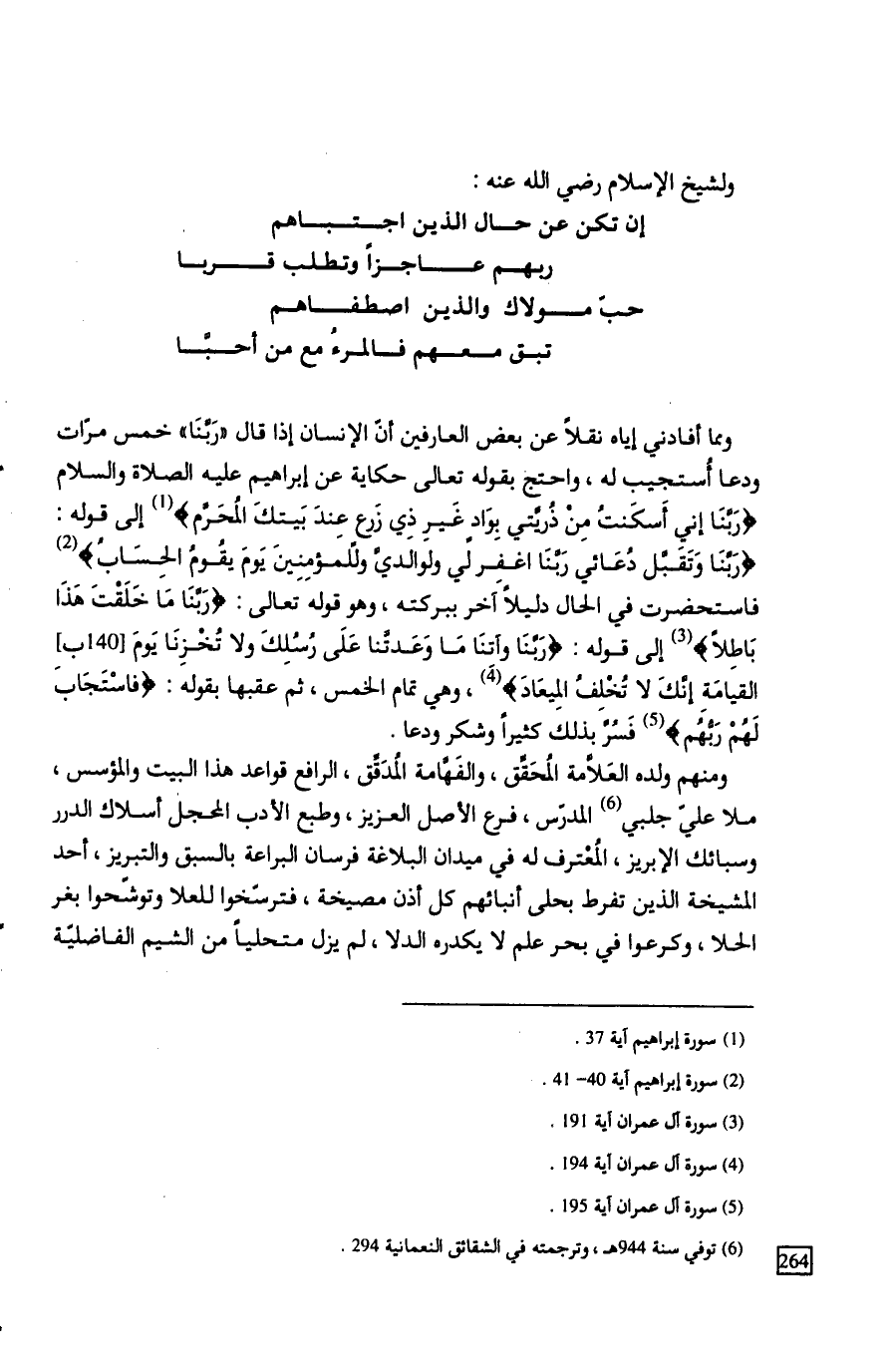 ومما أفادني إياه نقلاً عن بعض العارفين أنّ الإنسان إذا قال رَبَّنَا خمس مرات ودعا أُستجيب له، واحتج بقوله تعالى حكاية عن إبراهيم عليه الصلاة والسلام (رَبَّنَا إني أَسكَنتُ مِنْ ذُريَّتي بِوَادٍ غَيرِ ذِي زَرعٍ عِندَ بَيتكَ المُحَرَّم) إلى قوله: (رَبَّنَا وَتَقَبَّل دُعَائي رَبَّنَا اغفِر لي ولوالديَّ وللمؤمِنِينَ يَومَ يقُومُ الحِسَابُ) فاستحضرت في الحال دليلاً آخر ببركته، وهو قوله تعالى: (رَبَّنَا مَا خَلَقْتَ هَذَا بَاطِلاً) إلى قوله: (رَبَّنَا وآتِنَا مَا وَعَدتَّنا عَلَى رُسُلِكَ ولا تُخْزِنَا يَومَ القيامَةِ إنَّكَ لا تُخْلِفُ المِيعَادَ)، وهي تمام الخمس، ثم عقبها بقوله: (فاسْتَجَابَ لَهُمْ رَبُّهُم) فَسُرَّ بذلك كثيراً وشكر ودعا.