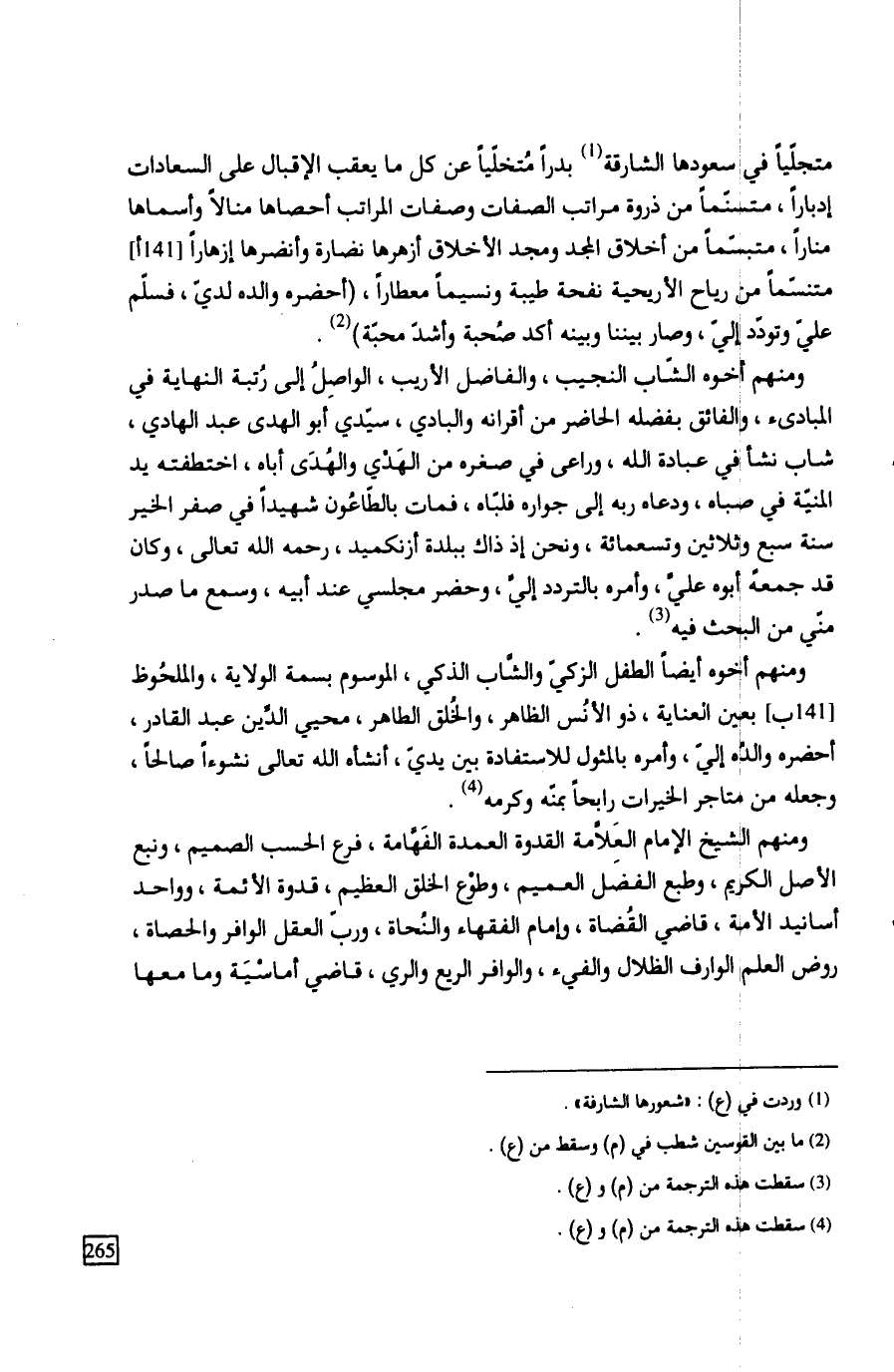 ومنهم أخوه أيضاً الطفل الزكيّ والشَّاب الذكي، الموسوم بسمة الولاية، والملحُوظ بعين العناية، ذو الأنُس الظاهر، والخُلق الطاهر، محيي الدِّين عبد القادر، أحضره والدُه إليّ، وأمره بالمثول للاستفادة بين يديّ، أنشأه الله تعالى نشوءاً صالحاً، وجعله من متاجر الخيرات رابحاً بمنّه وكرمه.