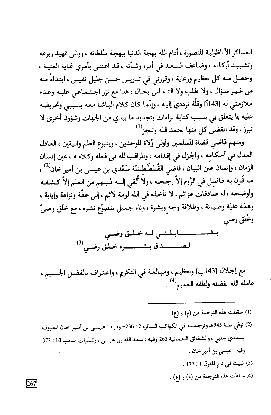 ومنهم قاضي قضاة المسلمين وأولى وُلاة الموحدين، وينبوع العلم واليقين، العادل العدل في أحكامِه، والجزل في إقدامه، والمراقب لله في فعله وكلامه، عين إنسان الزمان، وإنسان عين البيان، قاضي القُسْطَنْطِينيّة سَعْدي بن عيسى بن أمير خان، ما قُرن به فاضِل في الرُّوم إلاّ رجحه، ولا أُلقي إليه مُبهم من العلم إلاّ كشفه وأوضحه، له صادقات عزائم، لا تأخذه في الله لومة لائم، إلى عفّة ونزاهة وإيابة، وهمّة عليّة وصيانة، وطلاقة وجهٍ وبشرة، وناء جميل يتضوّع نشره، مع خَلق وضيّ وخُلق رضي: