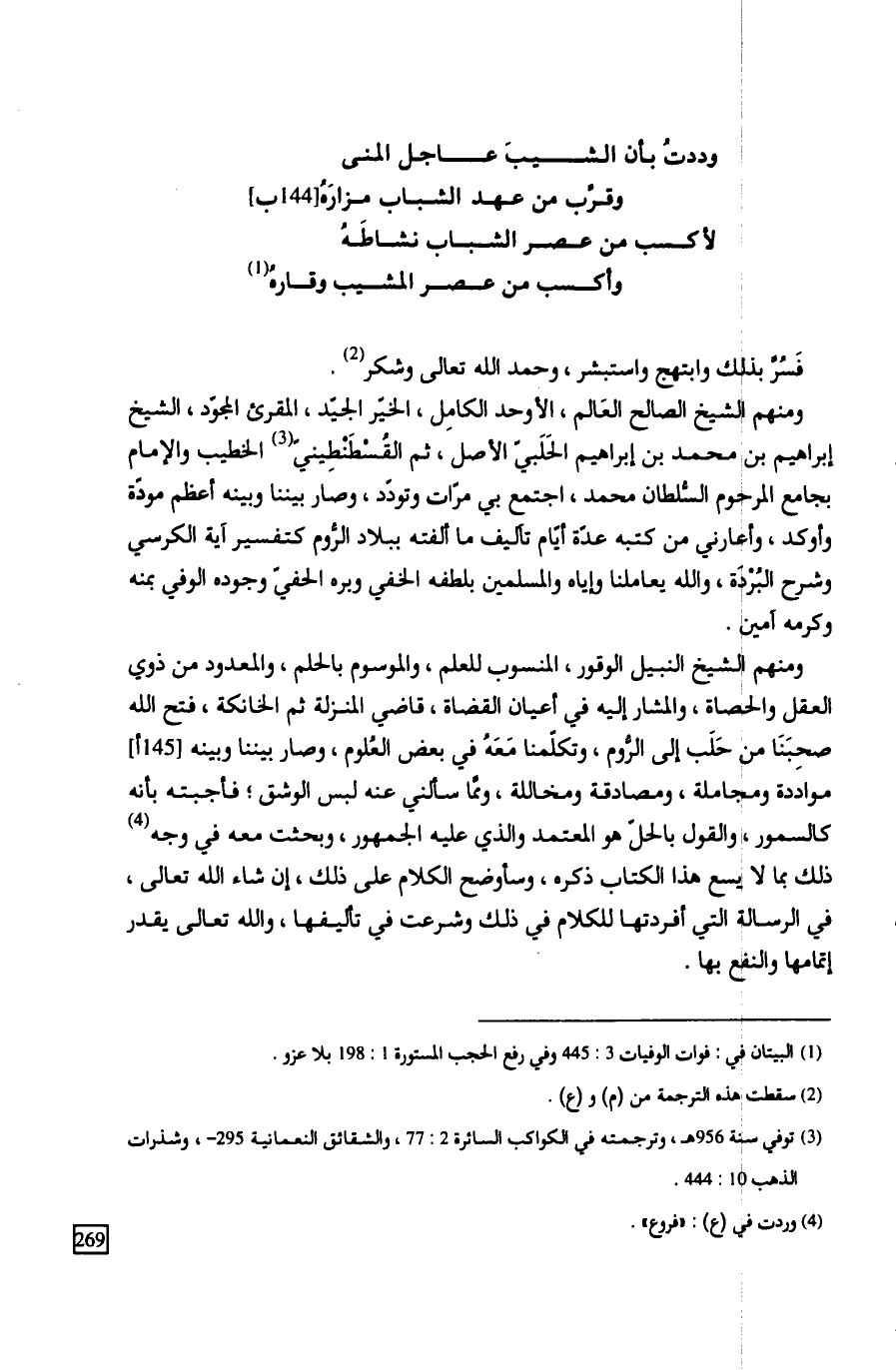 ومنهم الشيخ النبيل الوقور، المنسوب للعلم، والموسوم بالحلم، والمعدود من ذوي العقل والحصاة، والمشار إليه في أعيان القضاة، قاضي المنزلة ثم الخانكة، فتح الله صحِبَنَا من حَلَب إلى الرُّوم، وتكلمنا مَعَهُ في بعض العُلوم، وصار بيننا وبينه مواددة ومجاملة، ومصادقة ومخاللة، وممَّا سألني عنه لبس الوشق فأجبته بأنه كالسمور والقول بالحلّ هو المعتمد والذي عليه الجمهور، وبحثت معه في وجه ذلك بما لا يسع هذا الكتاب ذكره، وسأوضح الكلام على ذلك إن شاء الله تعالى في الرسالة التي أفردتها للكلام في ذلك وشرعت في تأليفها، والله تعالى يقدر إتمامها والنفع بها.