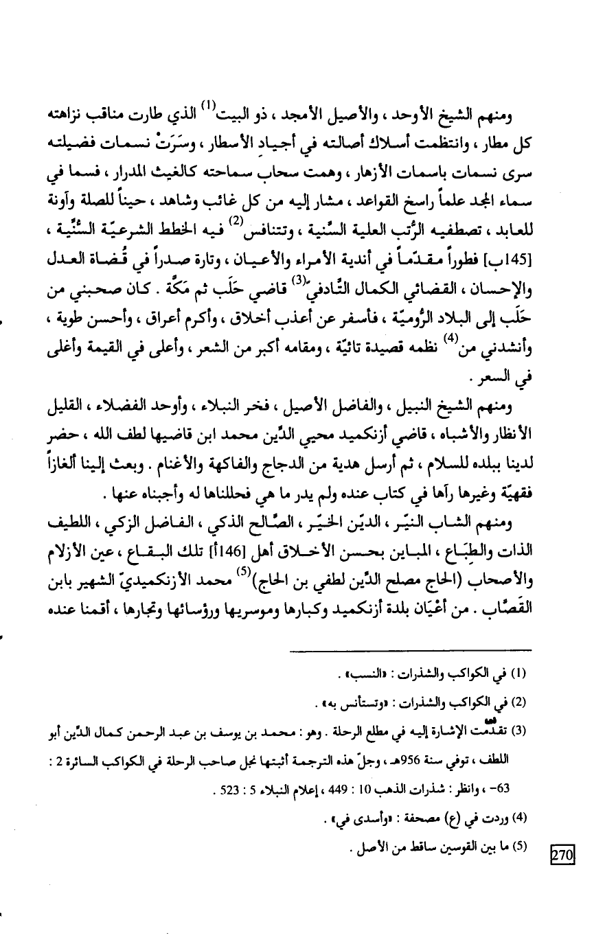 ومنهم الشيخ الأوحد، والأصيل الأمجد، ذو البيت الذي طارت مناقب نزاهته كل مطار، وانتظمت أسلاك أصالته في أجيادِ الأسطار، وسَرَتْ نسمات فضيلته سرى نسمات باسمات الأزهار، وهمت سحاب سماحته كالغيث المدرار، فسما في سماء المجد علماً راسخ القواعد، مشار إليه من كل غائب وشاهد، حيناً للصلة وآونة للعابد، تصطفيه الرُّتب العلية السَّنية، وتتنافس فيه الخطط الشرعيّة السُّنِّية، فطوراً مقدماً في أندية الأمراء والأعيان، وتارة صدراً في قُضاة العدل والإحسان، القضائي الكمال التَّادفيّ قاضي حَلَب ثم مَكَّة. كان صحبني من حَلَب إلى البلاد الرُّوميّة، فأسفر عن أعذب أخلاق، وأكرم أعراق، وأحسن طوية، وأنشدني من نظمه قصيدة تائيّة، ومقامه أكبر من الشعر، وأعلى في القيمة وأغلى في السعر.