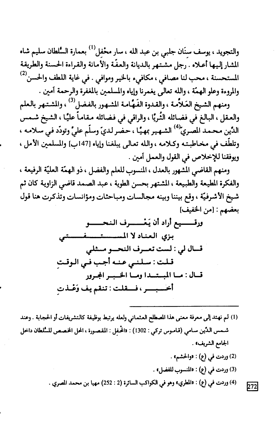 والتجويد، يوسف سِنَان جلبي بن عبد الله، سار محْفِل بعمارة السُّلطان سليم شاه المشار إليها أعلاه. رجل مشتهر بالديانة والعفّة والأمانة والقراءة الحسنة والطريقة المستحسنة، محب لنا مصافي، مكافيء بالخير وموافي. في غاية اللطف والحسن والمروءة وعلو الهمّة، والله تعالى يغمرنا وإياه والمسلمين بالمغفرة والرحمة آمين.