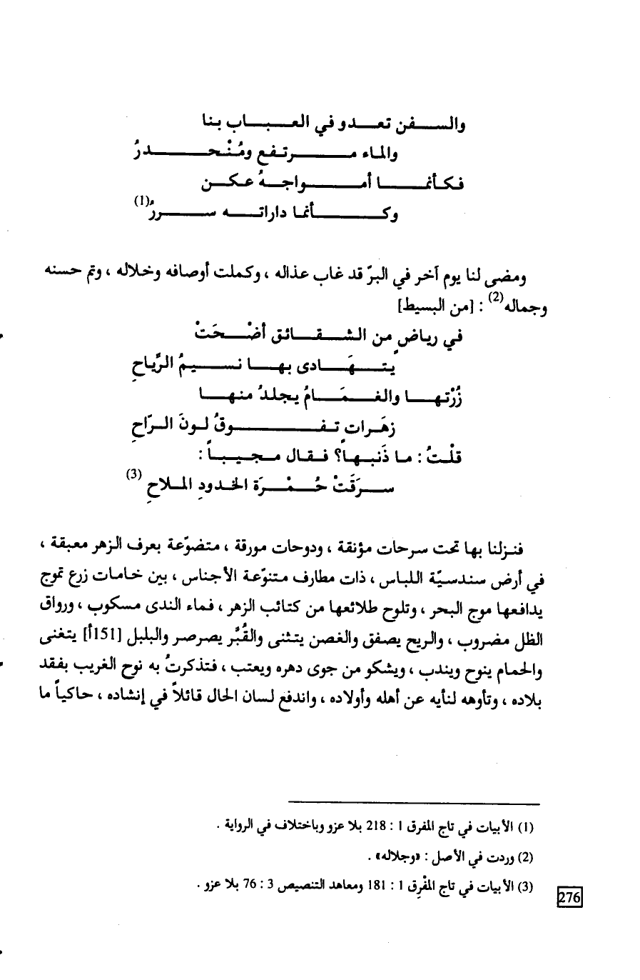 فنزلنا بها تحت سرحات مؤنقة، ودوحات مورقة، متضوعة بعرف الزهر معبقة، في أرض سندسيّة اللباس، ذات مطارف متنوعة الأجناس، بين خامات زرع تموج يدافعها موج البحر، وتلوح طلائعها من كتائب الزهر، فماء الندى مسكوب، ورواق الظل مضروب، والريح يصفق والغصن يتثنى والقُبَّر يصرصر والبلبل