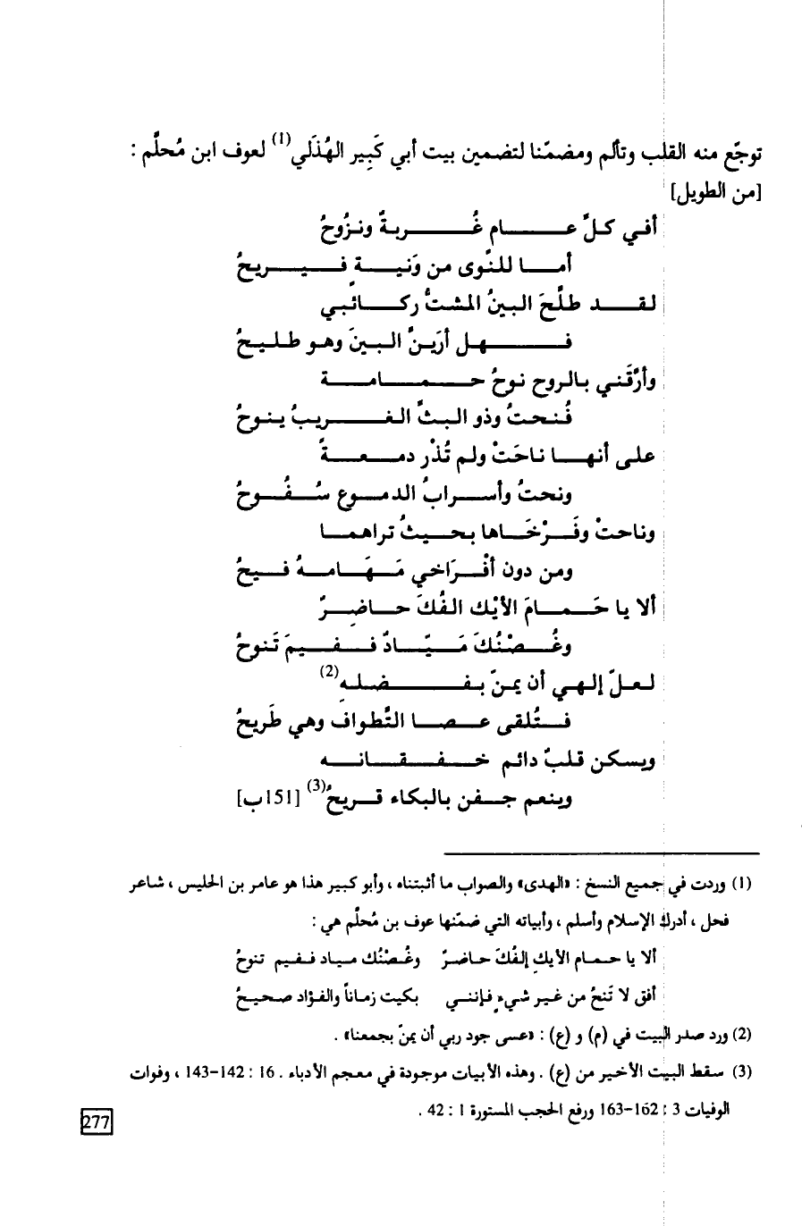 توجع منه القلب وتألم ومضمنا لتضمين بيت أبي كَبِير الهُذَلي لعوف ابن مُحلَّم: