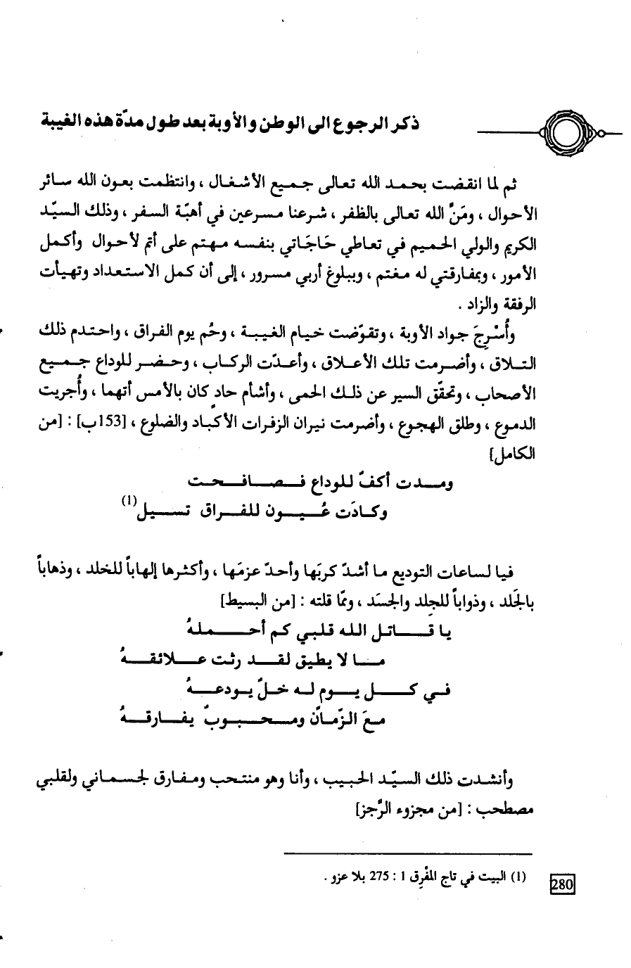 وأُسْرِجَ جواد الأوبة، وتقوضت خيام الغيبة، وحُم يوم الفراق، واحتدم ذلك التلاق، وأضرمت تلك الأعلاق، وأعدّت الركاب، وحضر للوداع جميع الأصحاب، وتحقّق السير عن ذلك الحمى، وأشأم حادٍ كان بالأمس أتهما، وأُجريت الدموع، وطلق الهجوع، وأضرمت نيران الزفرات الأكباد والضلوع: