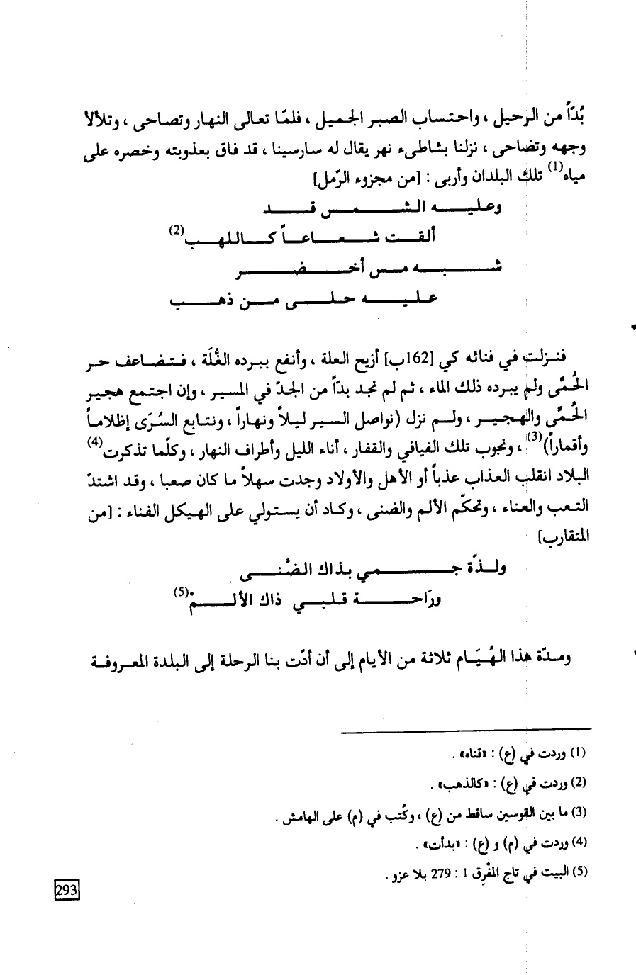 فنزلت في فنائه كي أزيح العلة، وأنفع ببرده الغُّلَة، فتضاعف حر الحُمَّى ولم يبرده ذلك الماء، ثم لم نجد بدّاً من الجدّ في المسير، وإن اجتمع هجير الحُمَّى والهجير، ولم نزل (نواصل السير ليلاً ونهاراً، ونتابع السُرَى إظلاماً وأقماراً)، ونجوب تلك الفيافي والقفار، أناء الليل وأطراف النهار، وكلّما تذكرت البلاد انقلب العذاب عذباً أو الأهل والأولاد وجدت سهلاً ما كان صعبا، وقد اشتدّ التعب والعناء، وتحكّم الألم والضنى، وكاد أن يستولي على الهيكل الفناء: