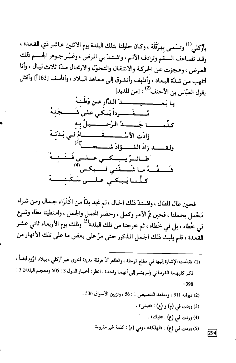 بأرْكلي وتسّمى بِهرَقْلَة، وكان حلولنا بتلك البلدة يوم الاثنين عاشر ذي القعدة، وقد تضاعف السقم وترادف الألم، واشتدّ بي المرض، وغيَّر جوهر الجسم ذلك العرض، وعجزت عن الحركة والانتقال والتحوّل والارتحال مدّة ثلاث ليال، وأنا أتلهب من شدّة البعاد، وأتلهف وأتشوق إلى معاهد البلاد، وأتأسف وأتمثل بقول العبّاس بن الأحنف: