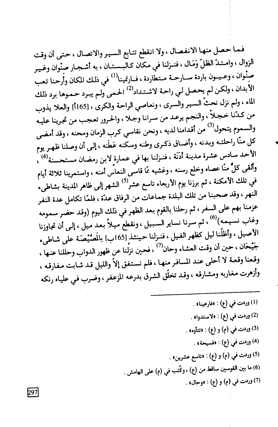 فما حصل منها الانفصال، ولا انقطع تتابع السير والاتصال، حتى آن وقت الزوال، وامتدّ الظلّ وَمَال، فنزلنا في مكان كالبستان، به أشجار صِنْوان وغير صِنْوان، وعيون باردة سارحة متطاردة، فارتمينا في ذلك المكان وأرحنا تعب الأبدان، ولكن لم يحصل لي راحة لاشتداد الحمى ولم يبرد حموها برد ذلك الماء، ولم نزل نحثّ السير والسرى، ونعاصي الراحة والكرى، والعلا يذوب من كدّنا خجلاً، والنجم يرعد من سرانا وجلا، والحرور تعجب من تجرينا عليه والسموم يتحول من أقدامنا لديه، ونحن نقاسي كرب الزمان ومحنه، وقد أمضى كل منّا راحلته وبدنه، وأضاق ذكرى وطنه وسكنه عَطَنه، إلى أن وصلنا ظهر يوم الأحد