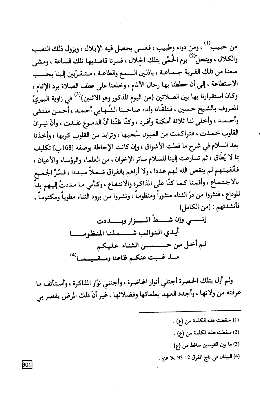 فتراكمت من العيون سُحبها، وتزايد من القلوب كربها، وأخذنا بعد السلام في شرح ما فعلت الأشواق، وإن كانت الإحاطة بوصفه تكليف بما لا يُطَاق، ثم تسارعت إلينا للسلام سائر الإخوان، من العلماء والرؤساء والأعيان، فألفيتهم لم ينقص الله لهم عددا، ولا أراهم بالفراق شملاً مبددا، فسُرَّ الجميع بالاجتماع، وأقمنا كما كنّا على المذاكرة والانتفاع، وكأني ما مددتُ إليهم يداً للوداع، فنثروا من درّ الثناء منثوراً ومنظوماً، ونشروا من برود الثناء مطوياً ومكتوماً، فأنشدتهم: