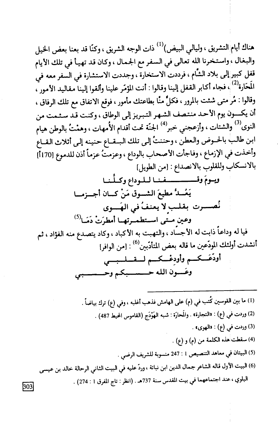 هناك أيام التشريق، وليالي البيض) ذات الوجه الشريق، وكنّا قد بعنا بعض الخيل والبغال، واستخرنا الله تعالى في السفر مع الجمال، وكان قد تهيأ في تلك الأيام قفل كبير إلى بلاد الشَّام، فرددت الاستخارة، وجددت الاستشارة في السفر معه في المَحَارة، فجاء أكابر القفل إلينا وقالوا: أنت المؤمّر علينا وألقوا إلينا مقاليد الأمور، وقالوا: مُر متى شئت بالمرور، فكلٌّ منَّا بطاعتك مأمور، فوقع الاتفاق مع تلك الرفاق، أن يكون يوم الأحد منتصف الشهر التبريز إلى الوطاق، وكنت قد سئمت من النوى والشتات، وأزعجني خبر الجنّة تحت أقدام الأُمهات، وهمْتُ بالوطن هيام ابن طالب بالحوض والعطن، وحننتُ إلى تلك البقاع حنينه إلى أثلاث القاع وأخذت في الإزماع، وفاجأت الأصحاب بالوداع، وعزمتُ عزماً أذن للدموع بالانسكاب وللقلوب بالانصداع: