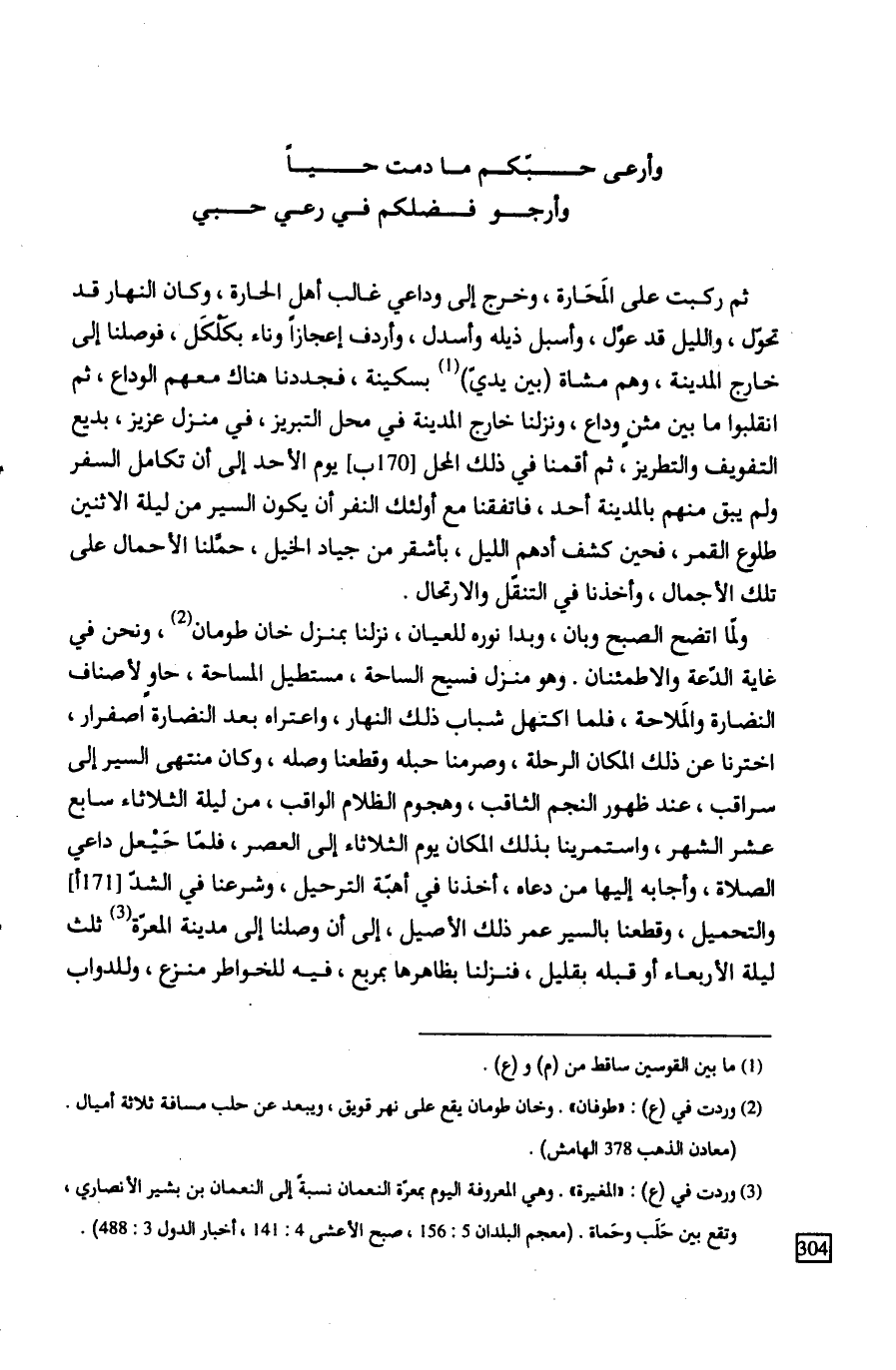 ولمّا اتضح الصبح وبان، وبدا نوره للعيان، نزلنا بمنزل خان طومان، ونحن في غاية الدّعة والاطمئنان. وهو منزل فسيح الساحة، مستطيل المساحة، حاوٍ لأصناف النضارة والمَلاحة، فلما اكتهل شباب ذلك النهار، واعتراه بعد النضارة اصفرار، اخترنا عن ذلك المكان الرحلة، وصرمنا حبله وقطعنا وصله، وكان منتهى السير إلى سراقب، عند ظهور النجم الثاقب، وهجوم الظلام الواقب، من ليلة الثلاثاء سابع عشر الشهر، واستمرينا بذلك المكان يوم الثلاثاء إلى العصر، فلمّا حَيْعل داعي الصلاة، وأجابه إليها من دعاه، أخذنا في أهبّة الترحيل، وشرعنا في الشدّ والتحميل، وقطعنا بالسير عمر ذلك الأصيل، إلى أن وصلنا إلى مدينة المعرّة ثلث ليلة الأربعاء أو قبله بقليل، فنزلنا بظاهرها بمربع، فيه للخواطر منزع، وللدواب
