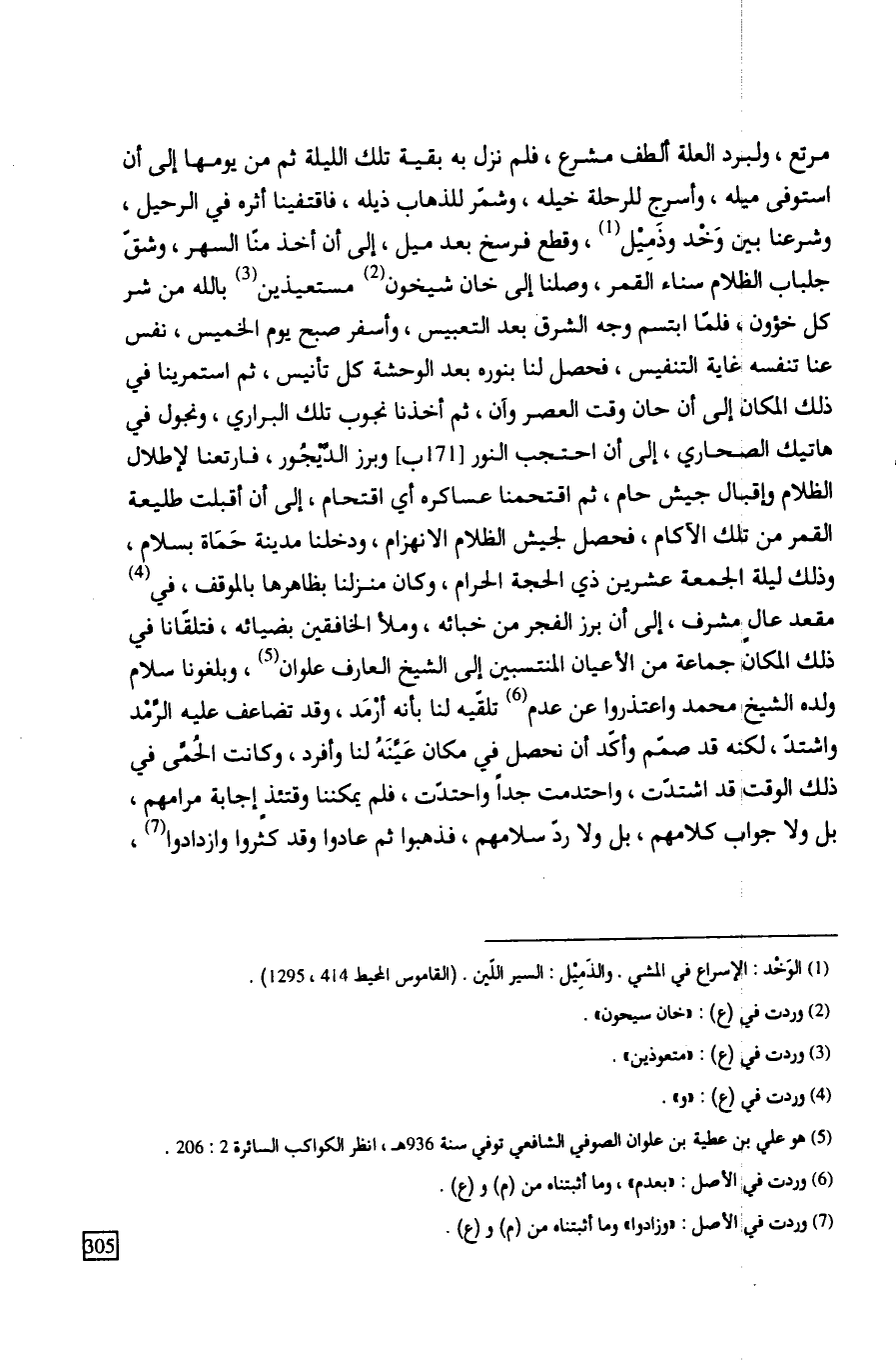 فارتعنا لإطلال الظلام وإقبال جيش حام، ثم اقتحمنا عساكره أي اقتحام، إلى أن أقبلت طليعة القمر من تلك الآكام، فحصل لجيش الظلام الانهزام، ودخلنا مدينة حَمَاة بسلام، وذلك ليلة الجمعة عشرين ذي الحجة الحرام، وكان منزلنا بظاهرها بالموقف، في مقعد عالٍ مشرف، إلى أن برز الفجر من خبائه، وملأ الخافقين بضيائه، فتلقّانا في ذلك المكان جماعة من الأعيان المنتسبين إلى الشيخ العارف علوان، وبلغونا سلام ولده الشيخ محمد واعتذروا عن عدم تلقّيه لنا بأنه أرْمَد، وقد تضاعف عليه الرَّمْد واشتدّ، لكنه قد صمّم وأكّد أن نحصل في مكان عَيَّنَهُ لنا وأفرد، وكانت الحُمَّى في ذلك الوقت قد اشتدّت، واحتدمت جداً واحتدّت، فلم يمكننا وقتئذٍ إجابة مرامهم، بل ولا جواب كلامهم، بل ولا ردّ سلامهم، فذهبوا ثم عادوا وقد كثروا وازدادوا،