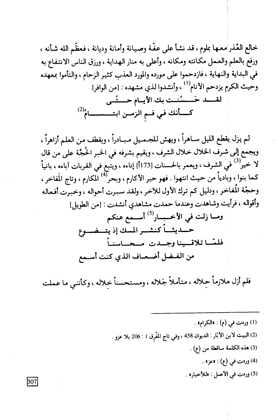 خالع العُذر معها بملوم، قد نشأ على عفّة وصيانة وأمانة وديانة، فعظّم الله شأنه، ورفع بالعلم والعمل مكانته ومكانه، وأعلى به منار الهداية، ورزق الناس الانتفاع به في البداية والنهاية، فازدحموا على مورده والمورد العذب كثير الزحام، والتأموا بمعهده وحيث الكرم يزدحم الأنام، وأنشدوا لذي مشهده: