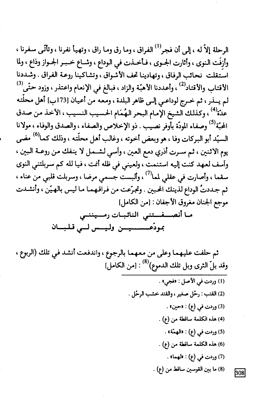 الرحلة إلاّ له، إلى أن فجر الفراق، وما رق وما راق، وتهيأ نفرنا، وتأتّى سفرنا، وأزِفَت النوى، وأثارت الجوى، فأخذت في الوداع، وشاع خبر الجواز وذاع، ولما استقلت نحائب الرفاق، وتهادينا تحف الأشواق، وتشاكينا روعة الفراق. وشددنا الأقتاب والأقتاد، وأعددنا الأهبّة والزاد، فبالغ في الإنعام واعتذر، وزود حتّى لم يذر، ثم خرج لوداعي إلى ظاهر البلدة، ومعه من أعيان أهل محلّته عدّة، وكذلك الشيخ الإمام البحر الهُمَام الحسيب النسيب، الآخذ من صدق المحبّة وصفاء المودّة بأوفر