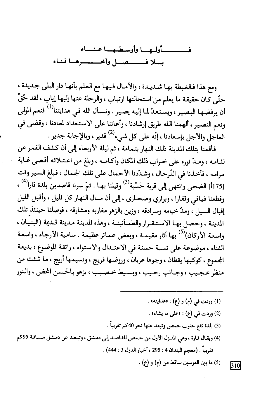 فأقمنا بتلك المدينة ذلك النهار بتمامة، ثم ليلة الأربعاء إلى أن كشف القمر عن لثامه، ومدّ نوره على خراب ذلك المكان وأكامه، وبلغ من اعتلائه أقصى غاية مرامه، فأخذنا في التّرحال، وشدّدنا الأحمال على تلك الجمال، فبلغ السير وقت الضحى وانتهى إلى قرية حَسْية وقيلنا بها. ثمّ سرنا قاصدين بلدة قارا، وقطعنا فيافي وقفارا، وبراري وصحارى، إلى أن مال النهار كل الميل، وأقبل الليل إقبال السيل، ومدّ خيامه وسرادقه، وزين بالزهر مغاربه ومشارقه، فوصلنا حينئذٍ تلك المدينة، وحصل بها الاستقرار والطمأنينة، وهذه المدينة مدينة قديمة (البنيان، واسعة الأركان) بها آثار مقيمة، وبعض عمائر عظيمة. سامية الأرجاء، واسعة الفناء، موضوعة على نسبة حسنة في الاعتدال والاستواء، رائقة الموضوع، بديعة المجموع، كوكبها يقظان، وجوها عريان، وروضها فريج، ونسيمها أريج، ما شئت من منظر عجيب، وجانب رحيب، وبسيط خصيب، يزهو بالحسن المحض، والنور