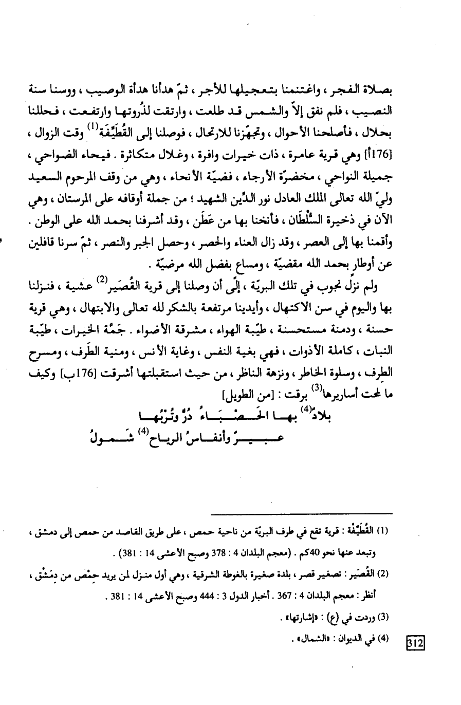 بصلاة الفجر، واغتنمنا بتعجيلها للأجر، ثمّ هدأنا هدأة الوصيب، ووسنا سنة النصيب، فلم نفق إلاّ والشمس قد طلعت، وارتقت لذُروتها وارتفعت، فحللنا بحلال، فأصلحنا الأحوال، وتجهّزنا للارتحال، فوصلنا إلى القُطَيِّفَة وقت الزوال، وهي قرية عامرة، ذات خيرات وافرة، وغلال متكاثرة. فيحاء الضواحي، جميلة النواحي، مخضرّة الأرجاء، فضيّة الأنحاء، وهي من وقف المرحوم السعيد وليّ الله تعالى الملك العادل نور الدِّين الشهيد من جملة أوقافه على المرستان، وهي الآن في ذخيرة السُّلْطَان، فأنخنا بها من عَطَن، وقد أشرفنا بحمد الله على الوطن. وأقمنا بها إلى العصر، وقد زال العناء والحصر، وحصل الجبر والنصر، ثمّ سرنا قافلين عن أوطارٍ بحمد الله مقضيّة، ومساعٍ بفضل الله مرضيّة.