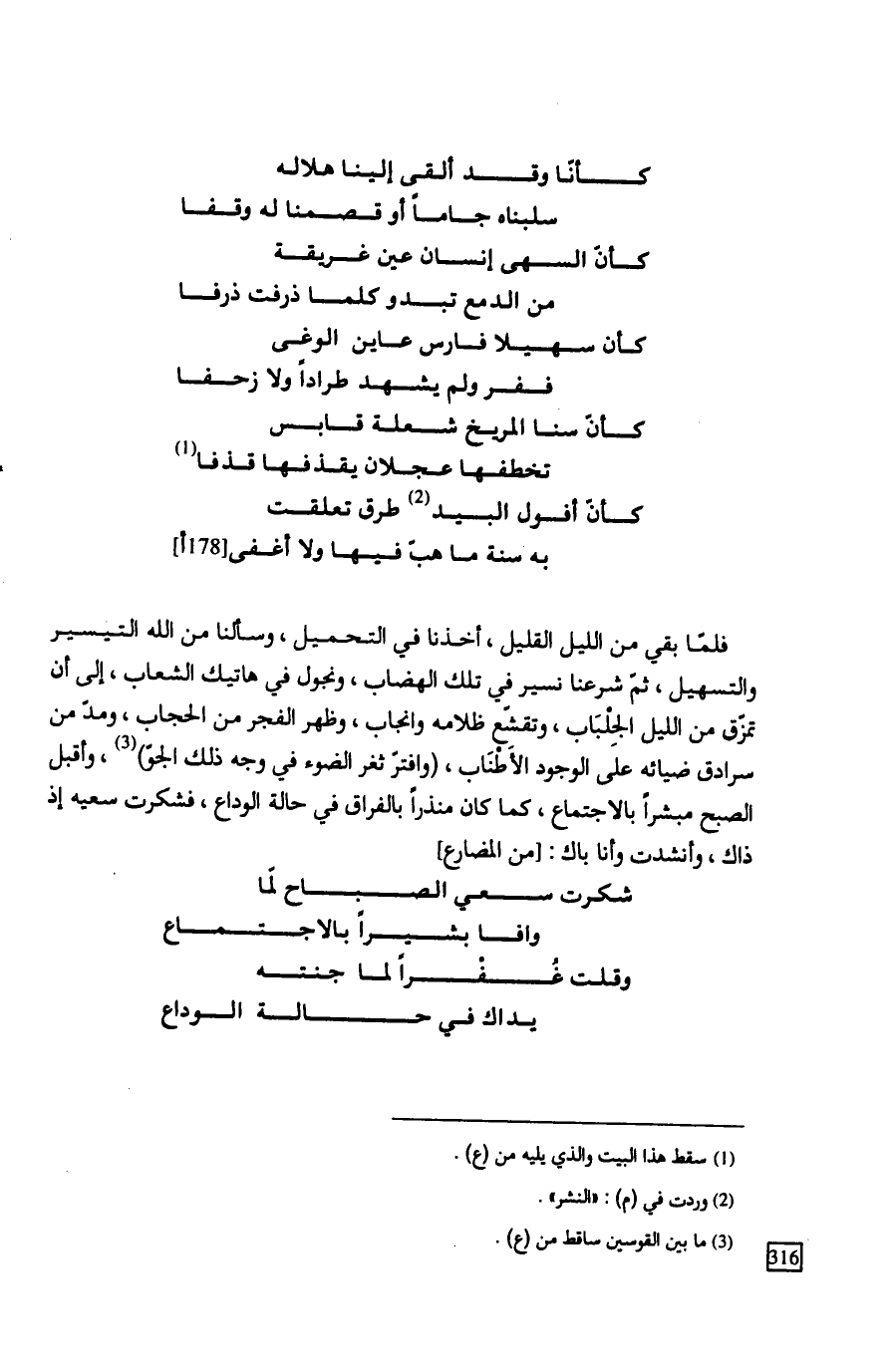 فلمّا بقي من الليل القليل، أخذنا في التحميل، وسألنا من الله التيسير والتسهيل، ثمّ شرعنا نسير في تلك الهضاب، ونجول في هاتيك الشعاب، إلى أن تمزّق من الليل الجِلْبَاب، وتقشّع ظلامه وانجاب، وظهر الفجر من الحجاب، ومدّ من سرادق