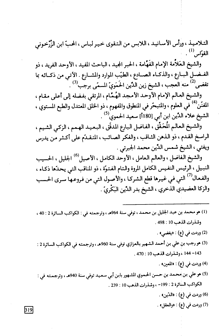 والشيخ العَلاَّمة الإمام الفَهَّامة، الحبر المجيد، الباحث المفيد، الأوحد الفريد، ذو الفضل البارع، والذكاء الصادع، الطيّب الموارد والمشارع. الآتي من ذكائه بما تقضى منه العجب، الشيخ زين الدِّين الحَمَويّ المسمّى برجب.