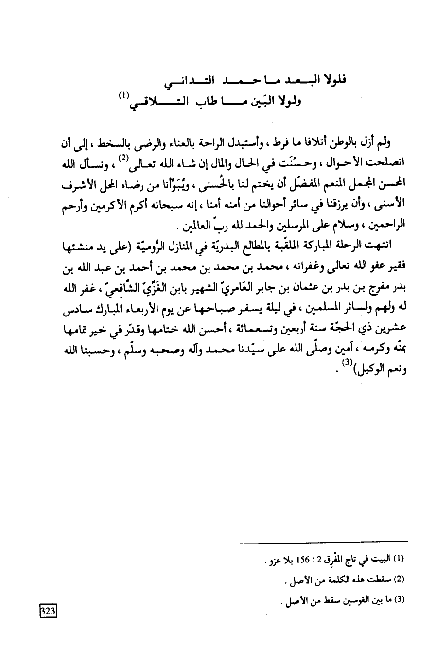 ولم أزل بالوطن أتلافا ما فرط، وأستبدل الراحة بالعناء والرضى بالسخط، إلى أن انصلحت الأحوال، وحسُنَت في الحال والمال إن شاء الله تعالى، ونسأل الله المحسن المجمل المنعم المفضّل أن يختم لنا بالحُسنى ويُبَوَّأنا من رضاه المحل الأشرف الأسنى، وأن يرزقنا في سائر أحوالنا من أمنه أمنا، إنه سبحانه أكرم الأكرمين وأرحم الراحمين، وسلام على المرسلين والحمد لله ربّ العالمين.