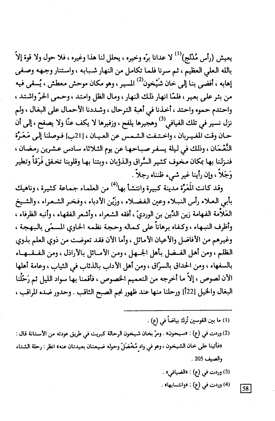 يعيش (رأس مُدْلج) لا عدانا بره وخيره، يحلل لنا هذا وغيره، فلا حول ولا قوة إلاّ بالله العلي العظيم، ثم سرنا فلما تكامل من النهار شبابه، واستنار وجهه وصفى إهابه، أفضى بنا إلى خان شَيْخون المسير، وهو مكان موحش معطش، يُسقى فيه من بئر على بعير، فلمّا انهار ذلك النهار، ومال الظل وامتد، وحمى الحرّ واشتد، واحتدم حموه واحتد، أخذنا في أهبة الترحال، وشددنا الأحمال على البغال، ولم نزل نسير في تلك الفيافي وهجيرها يلفح، وزفيرها لا يكف عنّا ولا يصفح، إلى أن حان وقت المغيربان، واختفت الشمس عن العيان، فوصلنا إلى مَعَرَّة النُّعْمَان، وذلك في ليلة يسفر صباحها عن يوم الثلاثاء سادس عشرين رمضان، فنزلنا بها بمكان مخوف كثير السُّراق والذؤبان، وبتنا بها وقلوبنا تخفق فَرَقاً وتطير وَجَلاً، وإن رأينا غير شيء ظنناه رجلاً.