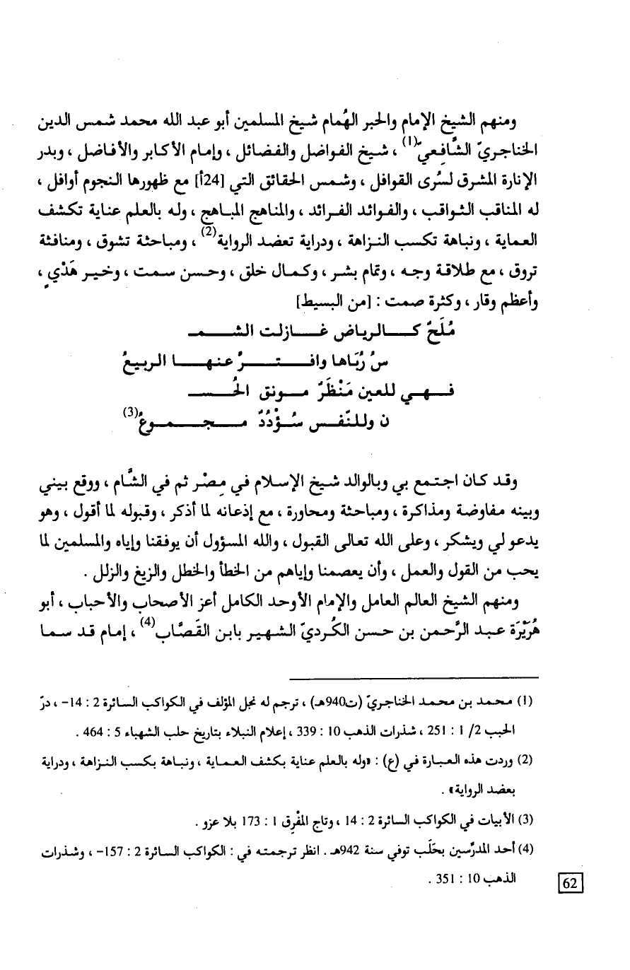 ومنهم الشيخ الإمام والحبر الهُمام شيخ المسلمين أبو عبد الله محمد شمس الدين الخناجريّ الشَّافِعيّ، شيخ الفواضل والفضائل، وإمام الأكابر والأفاضل، وبدر الإنارة المشرق لسُرى القوافل، وشمس الحقائق التي مع ظهورها النجوم أوافل، له المناقب الثواقب، والفوائد الفرائد، والمناهج المباهج، وله بالعلم عناية تكشف العماية، ونباهة تكسب النزاهة، ودراية تعضد الرواية، ومباحثة تشوق، ومنافثة تروق، مع طلاقة وجه، وتمام بشر، وكمال خلق، وحسن سمت، وخير هَدْيٍ، وأعظم وقار، وكثرة صمت: