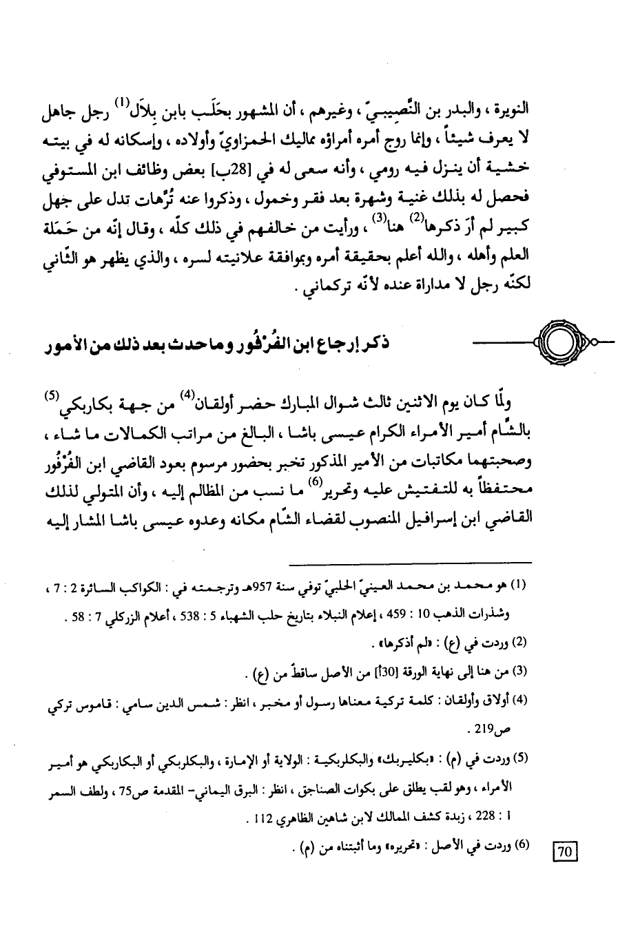 ولمّا كان يوم الاثنين ثالث شوال المبارك حضر أولقان من جهة بكاربكي بالشَّام أمير الأمراء الكرام عيسى باشا، البالغ من مراتب الكمالات ما شاء، وصحبتهما مكاتبات من الأمير المذكور تخبر بحضور مرسوم بعود القاضي ابن الفُرْفُور محتفظاً به للتفتيش عليه وتحرير ما نسب من المظالم إليه، وأن المتولي لذلك القاضي ابن إسرافيل المنصوب لقضاء الشّام مكانه وعدوه عيسى باشا المشار إليه