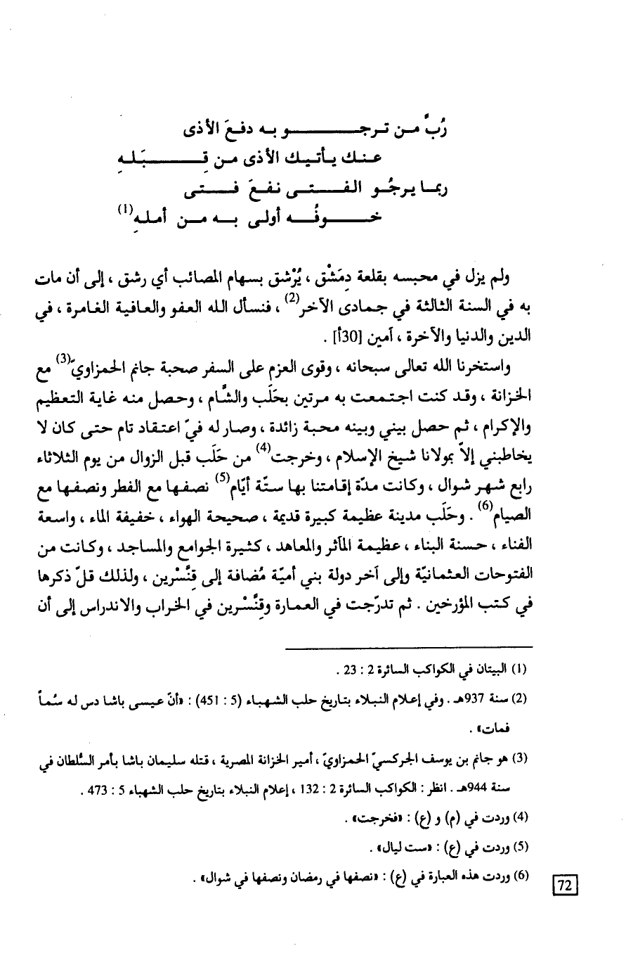 واستخرنا الله تعالى سبحانه وقوى العزم على السفر صحبة جانم الحمزاويّ مع الخزانة، وقد كنت اجتمعت به مرتين بحَلَب والشَّام، وحصل منه غاية التعظيم والإكرام، ثم حصل بيني وبينه محبة زائدة، وصار له فيّ اعتقاد تام حتى كان لا يخاطبني إلاّ بمولانا شيخ الإسلام، وخرجت من حَلَب قبل الزوال من يوم الثلاثاء رابع شهر شوال، وكانت مدّة إقامتنا بها ستة أيّام نصفها مع الفطر ونصفها مع الصيام. وحَلَب مدينة عظيمة كبيرة قديمة، صحيحة الهواء، خفيفة الماء، واسعة الفناء، حسنة البناء، عظيمة المآثر والمعاهد، كثيرة الجوامع والمساجد، وكانت من الفتوحات العثمانيّة وإلى آخر دولة بني أميّة مُضافة إلى قِنَّسْرين، ولذلك قلّ ذكرها في كتب المؤرخين. ثم تدرجت في العمارة وقِنَّسْرين في الخراب والاندراس إلى أن