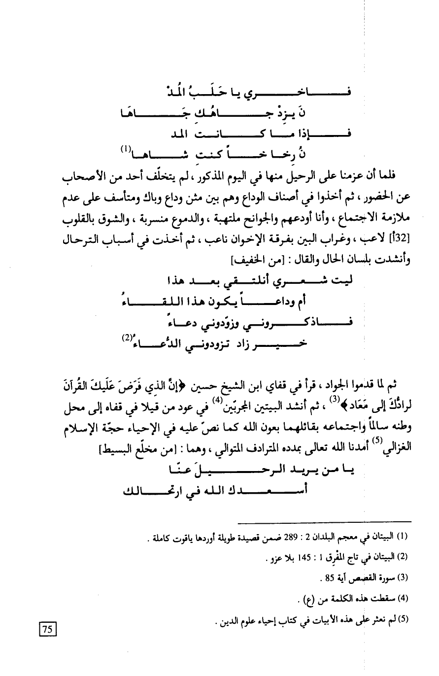 فلما أن عزمنا على الرحيل منها في اليوم المذكور، لم يتخلف أحد من الأصحاب عن الحضور، ثم أخذوا في أصناف الوداع وهم بين مثن وداع وباك ومتأسف على عدم ملازمة الاجتماع، وأنا أودعهم والجوانح ملتهبة، والدموع منسربة، والشوق بالقلوب لاعب، وغراب البين بفرقة الإخوان ناعب، ثم أخذت في أسباب الترحال وأنشدت بلسان الحال والقال: