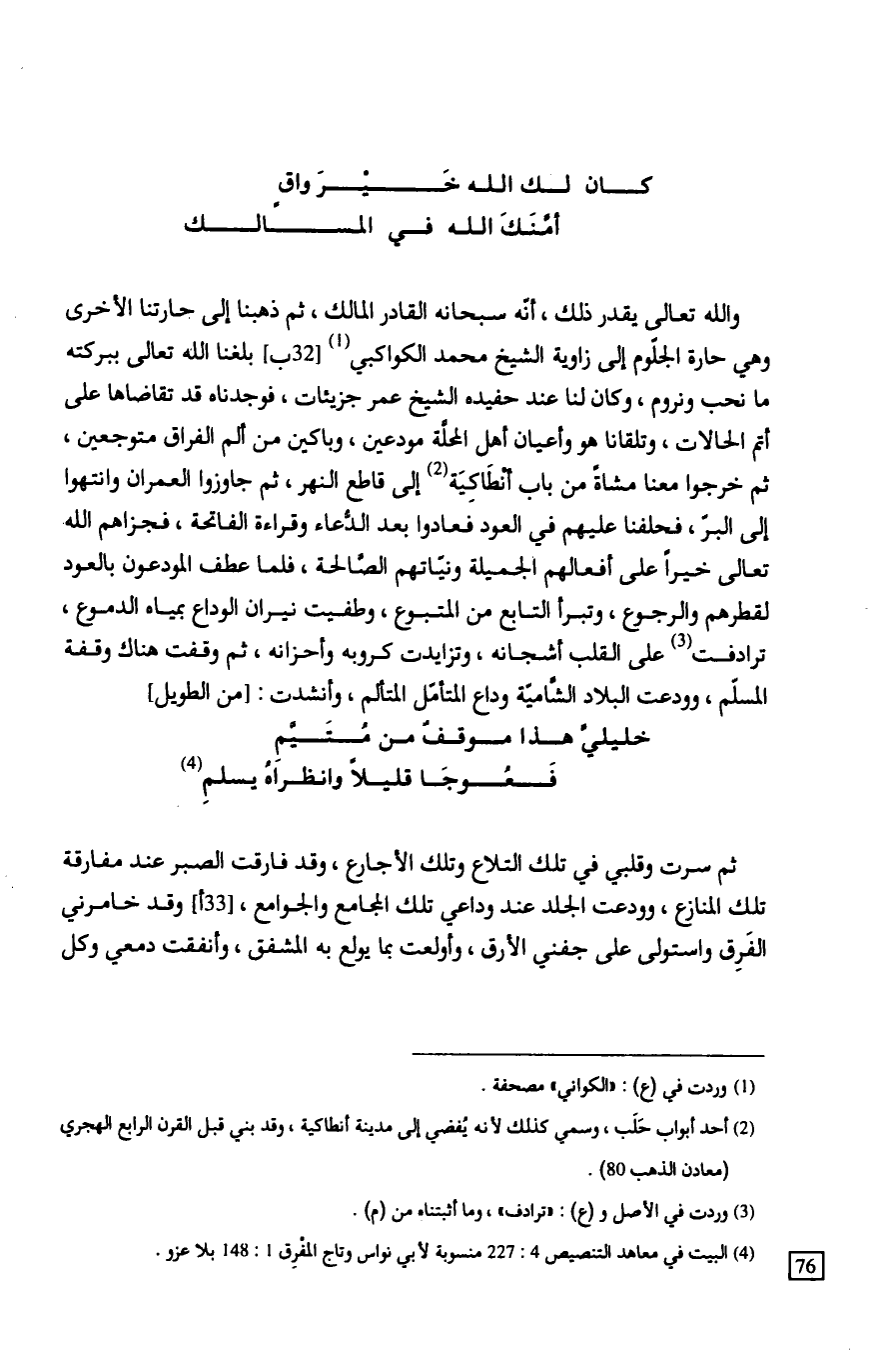 الحالات، وتلقانا هو وأعيان أهل المحلَّة مودعين، وباكين من ألم الفراق متوجعين، ثم خرجوا معنا مشاةً من باب أنْطَاكِيَة إلى قاطع النهر، ثم جاوزوا العمران وانتهوا إلى البرّ، فحلفنا عليهم في العود فعادوا بعد الدُّعاء وقراءة الفاتحة، فجزاهم الله تعالى خيراً على أفعالهم الجميلة ونياتهم الصَّالحة، فلما عطف المودعون بالعود لقطرهم والرجوع، وتبرأ التابع من المتبوع، وطفيت نيران الوداع بمياه الدموع، ترادفت على القلب أشجانه، وتزايدت كروبه وأحزانه، ثم وقفت هناك وقفة المسلم، وودعت البلاد الشَّاميّة وداع المتأمّل المتألم، وأنشدت:
