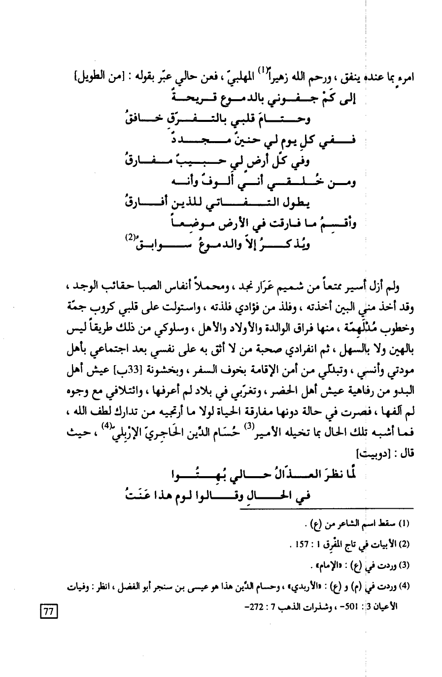 وجوه لم آلفها، فصرت في حالة دونها مفارقة الحياة لولا ما أرتجيه من تدارك لطف الله، فما أشبه تلك الحال بما تخيله الأمير حُسَام الدِّين الحَاجِريّ الإرْبِليّ، حيث قال: