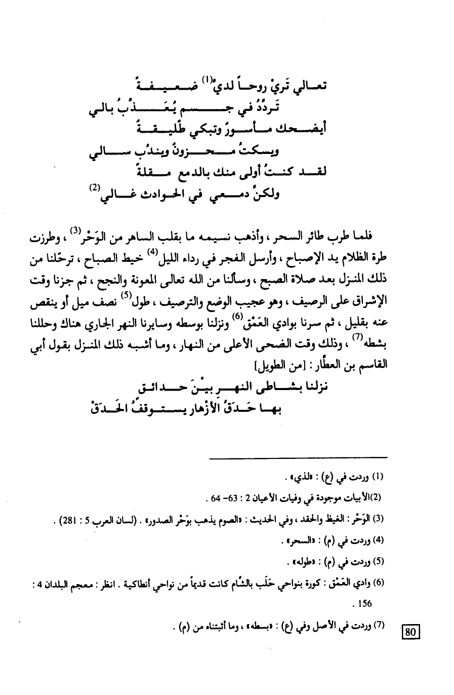 فلما طرب طائر السحر، وأذهب نسيمه ما بقلب الساهر من الوَحْر، وطرزت طرة الظلام يد الإصباح، وأرسل الفجر في رداء الليل خيط الصباح، ترحّلنا من ذلك المنزل بعد صلاة الصبح، وسألنا من الله تعالى المعونة والنجح، ثم جزنا وقت الإشراق على الرصيف، وهو عجيب الوضع والترصيف، طول نصف ميل أو ينقص عنه بقليل، ثم سرنا بوادي العَمْق ونزلنا بوسطه وسايرنا النهر الجاري هناك وحللنا بشطه، وذلك وقت الضحى الأعلى من النهار، وما أشبه ذلك المنزل بقول أبي القاسم بن العطَّار: