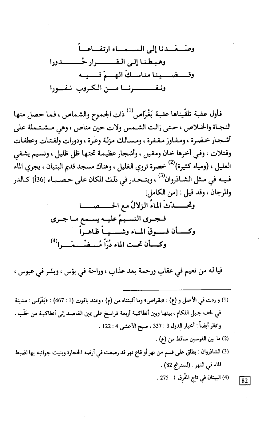 فأول عقبة تلقّيناها عقبة بَغْرَاص ذات الجموح والشماص، فما حصل منها النجاة والخلاص، حتى زالت الشمس ولات حين مناص، وهي مشتملة على أشجار خضرة، ومفاوز مقفرة، ومسالك مزلة وعرة، ودورات ولفتات وعطفات وفتلات، وفي آخرها خان ومقيل وأشجار عظيمة تحتها ظل ظليل ونسيم يشفي العليل، (ومياه كثيرة) خصرة تروي الغليل، وهناك مسجد قديم البنيان، يجري الماء فيه في مثل الشاذروان، ويتحدر في ذلك المكان على حصباء كالدر والمرجان، وقد قيل:
