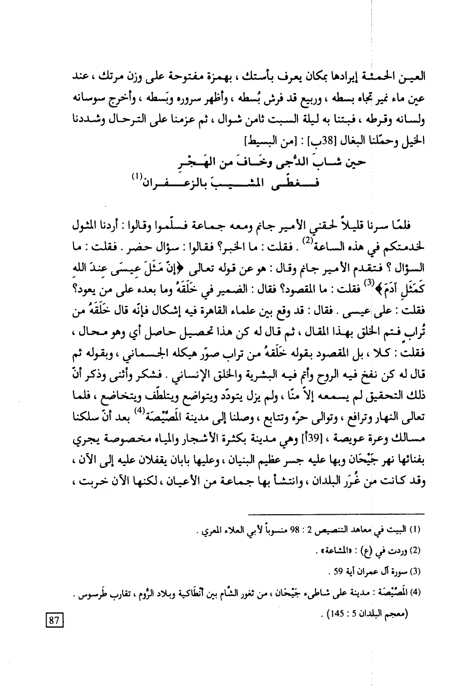 فلمّا سرنا قليلاً لحقني الأمير جانم ومعه جماعة فسلموا وقالوا: أردنا المثول لخدمتكم في هذه الساعة. فقلت: ما الخبر؟ فقالوا: سؤال حضر. فقلت: ما السؤال؟ فتقدم الأمير جانم وقال: هو عن قوله تعالى (إنّ مَثَلَ عِيسَى عِندَ اللهِ كَمَثَلِ آدَمَ) فقلت: ما المقصود؟ فقال: الضمير في خَلَقَهُ وما بعده على من يعود؟ فقلت: على عيسى. فقال: قد وقع بين علماء القاهرة فيه إشكال فإنّه قال خَلَقَهُ من تُرابٍ فتم الخلق بهذا المقال، ثم قال له كن هذا تحصيل حاصل أي وهو محال، فقلت: كلا، بل المقصود بقوله خَلَقهُ من تراب صور هيكله الجسماني، وبقوله ثم قال له كن نفخ فيه الروح وأتم فيه البشرية والخلق الإنساني. فشكر وأثنى وذكر أنّ ذلك التحقيق لم يسمعه إلاّ منّا، ولم يزل يتودد ويتواضع ويتلطف ويتخاضع، فلما تعالى النهار وترافع، وتوالى حره وتتابع، وصلنا إلى مدينة المَصِّيْصَة بعد أنّ سلكنا