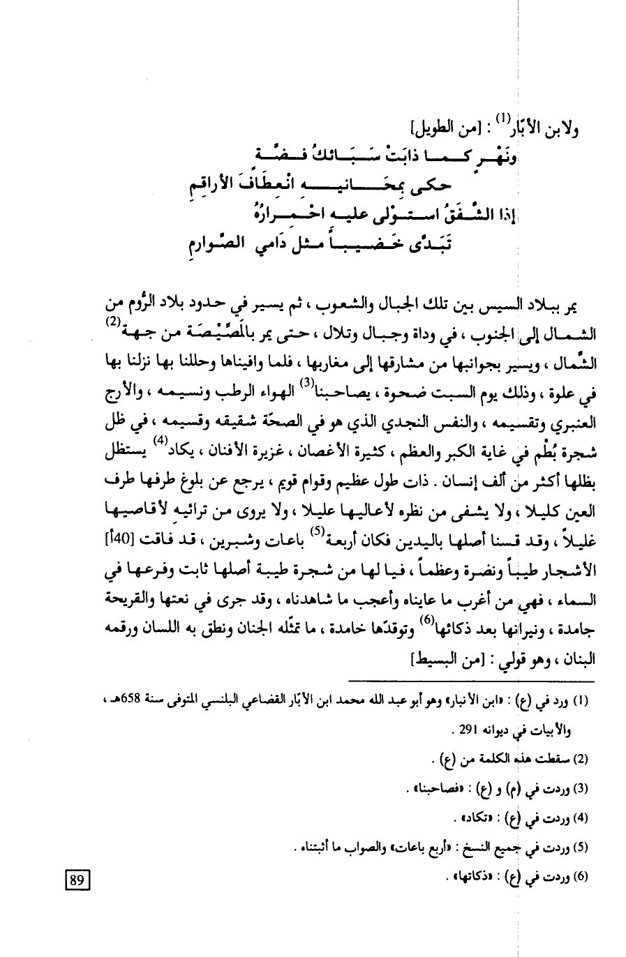 وتقسيمه، والنفس النجدي الذي هو في الصحّة شقيقه وقسيمه، في ظل شجرة بُطْم في غاية الكبر والعظم، كثيرة الأغصان، غزيرة الأفنان، يكاد يستظل بظلها أكثر من ألف إنسان. ذات طول عظيم وقوام قويم، يرجع عن بلوغ طرفها طرف العين كليلا، ولا يشفى من نظره لأعاليها عليلا، ولا يروى من ترائيهِ لأقاصيها غليلاً، وقد قسنا أصلها باليدين فكان أربعة باعات وشبرين، قد فاقت الأشجار طيباً ونضرة وعظماً، فيا لها من شجرة طيبة أصلها ثابت وفرعها في السماء، فهي من أغرب ما عايناه وأعجب ما شاهدناه، وقد جرى في نعتها والقريحة جامدة، ونيرانها بعد ذكائها وتوقدّها خامدة، ما تمثله الجنان ونطق به اللسان ورقمه البنان، وهو قولي: