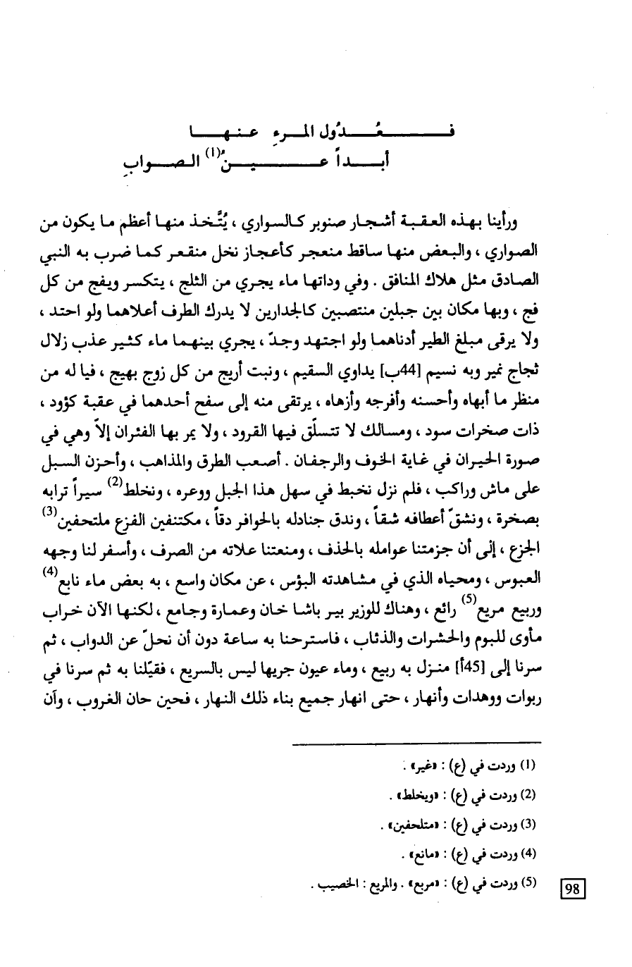 ورأينا بهذه العقبة أشجار صنوبر كالسواري، يُتَّخذ منها أعظم ما يكون من الصواري، والبعض منها ساقط منعجر كأعجاز نخل منقعر كما ضرب به النبي الصادق مثل هلاك المنافق. وفي وداتها ماء يجري من الثلج، يتكسر ويفج من كل فج، وبها مكان بين جبلين منتصبين كالجدارين لا يدرك الطرف أعلاهما ولو احتد، ولا يرقى مبلغ الطير أدناهما ولو اجتهد وجدّ، يجري بينهما ماء كثير عذب زلال ثجاج نمير وبه نسيم يداوي السقيم، ونبت أريج من كل زوج بهيج، فيا له من منظر ما أبهاه وأحسنه وأفرجه وأزهاه، يرتقى منه إلى سفح أحدهما في عقبة كؤود، ذات صخرات سود، ومسالك لا تتسلق فيها القرود، ولا يمر بها الفئران إلاّ وهي في صورة الحيران في غاية الخوف والرجفان. أصعب الطرق والمذاهب، وأحزن السبل على ماش وراكب، فلم نزل نخبط في سهل هذا الجبل ووعره، ونخلط سيراً ترابه بصخرة، ونشقّ أعطافه شقاً، وندق جنادله بالحوافر دقاً، مكتنفين الفزع ملتحفين الجزع، إلى أن جزمتنا عوامله بالحذف، ومنعتنا علاته من الصرف، وأسفر لنا وجهه العبوس، ومحياه الذي في مشاهدته البؤس، عن مكان واسع، به بعض ماء نابع وربيع مريع رائع، وهناك للوزير بير باشا خان وعمارة وجامع، لكنها الآن خراب مأوى للبوم والحشرات والذئاب، فاسترحنا به ساعة دون أن نحلّ عن الدواب، ثم سرنا إلى منزل به ربيع، وماء عيون جريها ليس بالسريع، فقيلنا به ثم سرنا في ربوات ووهدات وأنهار، حتى انهار جميع بناء ذلك النهار، فحين حان الغروب، وآن