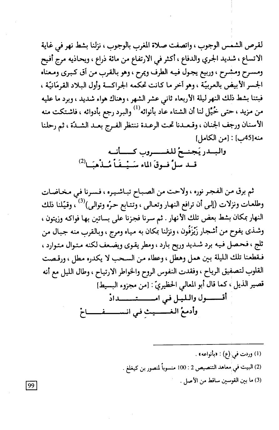 ثم برق من الفجر نوره، ولاحت من الصباح تباشيره، فسرنا في مخاضات وطلعات ونزلات (إلى أن ترافع النهار وتعالى، وتتابع حرّه وتوالى)، وقيّلنا ذلك النهار بمكان بشط بعض تلك الأنهار. ثم سرنا فجزنا على بساتين بها فواكه وزيتون، وشذى يفوح من أشجار زَيْزَفُون، ونزلنا بمكان به مياه ومرج، وبالقرب منه جبال من ثلج، فحصل فيه برد شديد وريح بارد، ومطر يقوى ويضعف لكنه متوال متوارد، فقطعنا تلك الليلة بين همل وهطل، وعطاء من السحب لا يكدره مطل، ورقصت القلوب لتصفيق الرياح، وفقدت النفوس الروح والخواطر الارتياح، وطال الليل مع أنه قصير الذيل، كما قال أبو المعالي الحظيريّ: