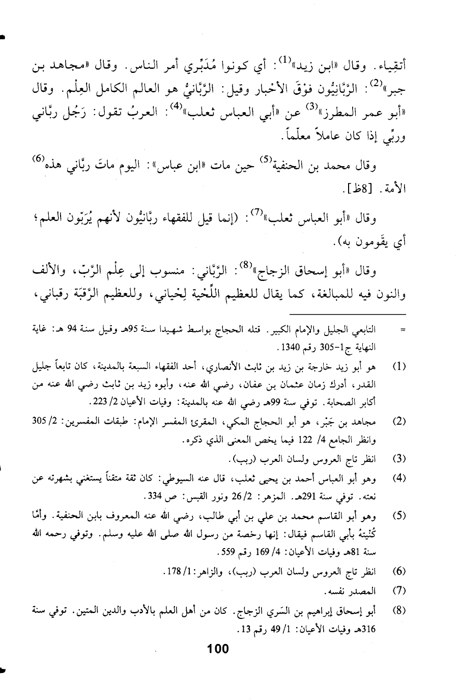 وقال أبو العباس ثعلب: (إنما قيل للفقهاء ربَّانيُّون لأنهم يُرَبّون العلم؛ أي يقَومون به).