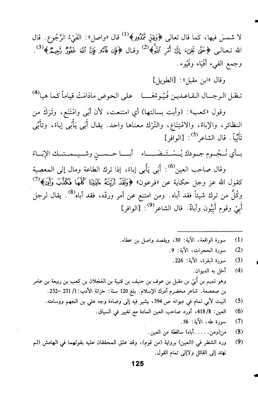 وقال صاحب العين: أَبَى يَأْبى إباءً، إذا ترك الطاعة ومال إلى المعصية كقول الله عز وجل حكاية