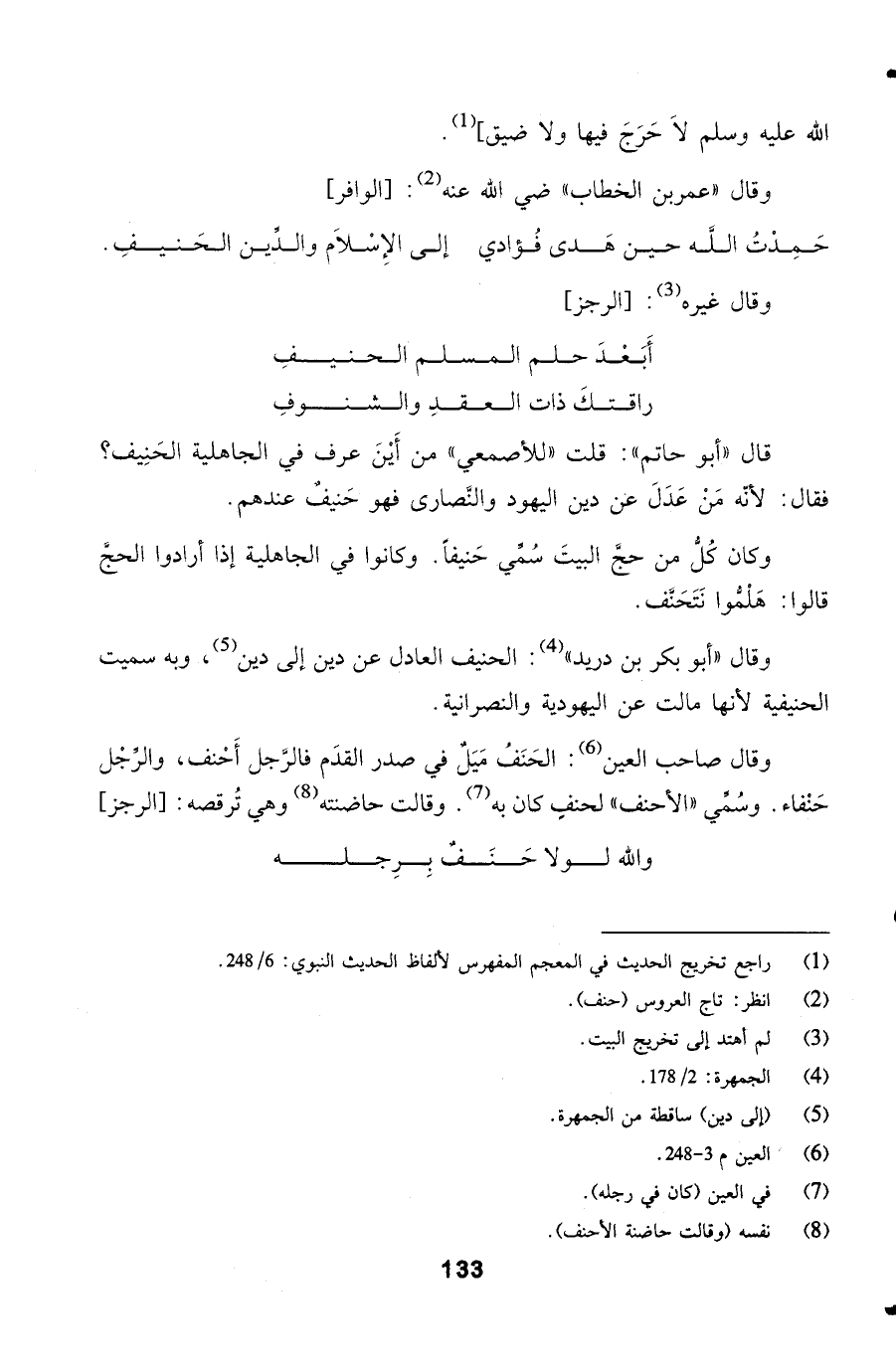 قال أبو حاتم: قلت للأصمعي من أَيْنَ عرف في الجاهلية الحَنِيف؟ فقال: لأنّه مَنْ عَدَلَ عن دين
