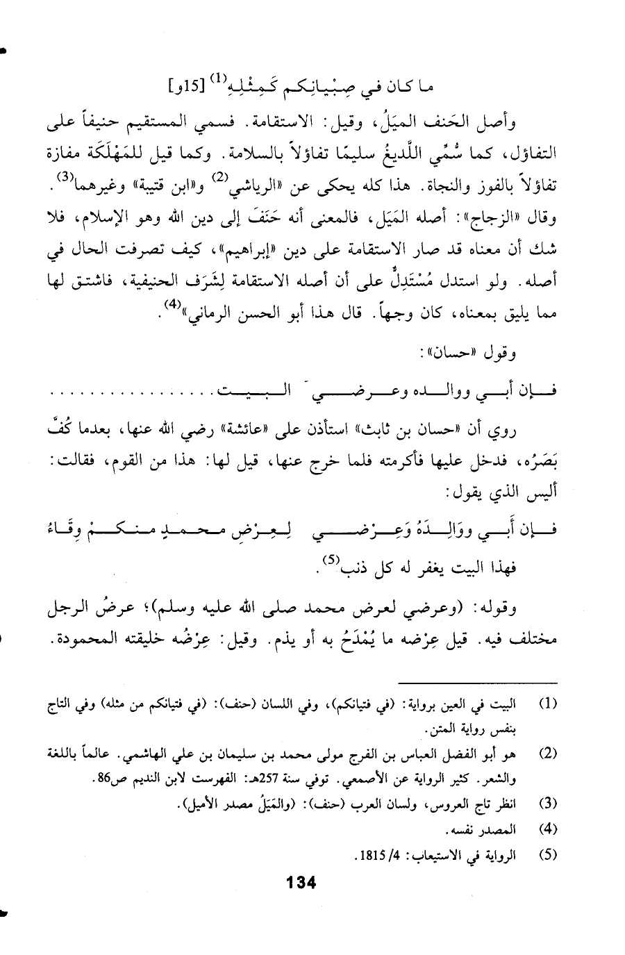 دين إبراهيم، كيف تصرفت الحال في أصله. ولو استدل مُسْتَدِلٌّ على أن أصله الاستقامة لِشَرَف