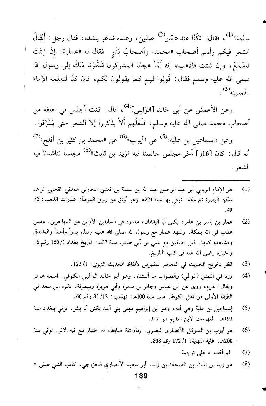 سلمة، فقال: كُنَّا عند عمّار بصفين، وعنده شاعر ينشده، فقال رجل: أَيُقَالُ الشعر فيكم وأنتم أصحاب محمد وأصحابُ بَدْرٍ. فقال