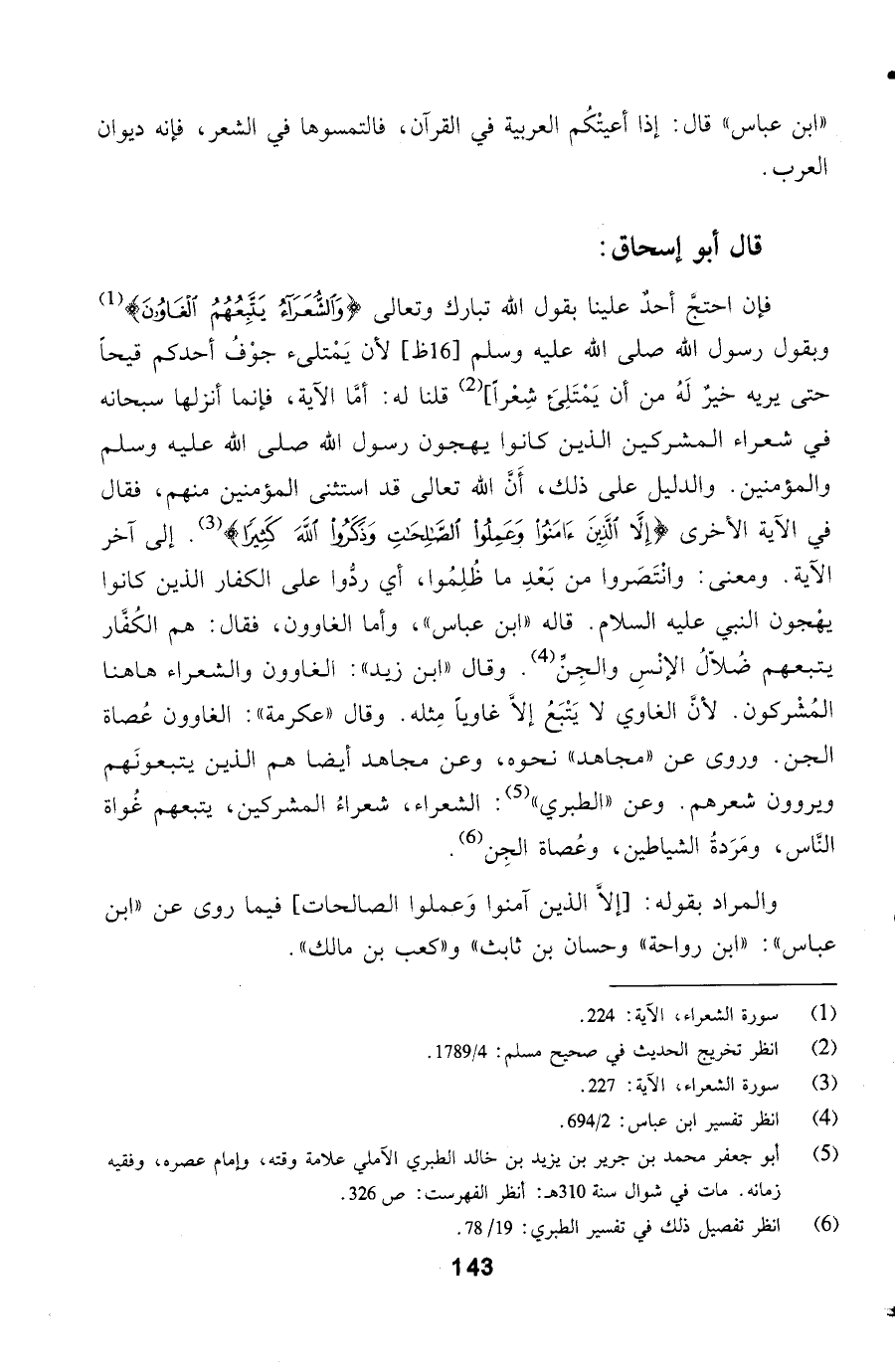 ابن عباس قال: إذا أعيتْكُم العربية في القرآن، فالتمسوها في الشعر، فإنه ديوان العرب.