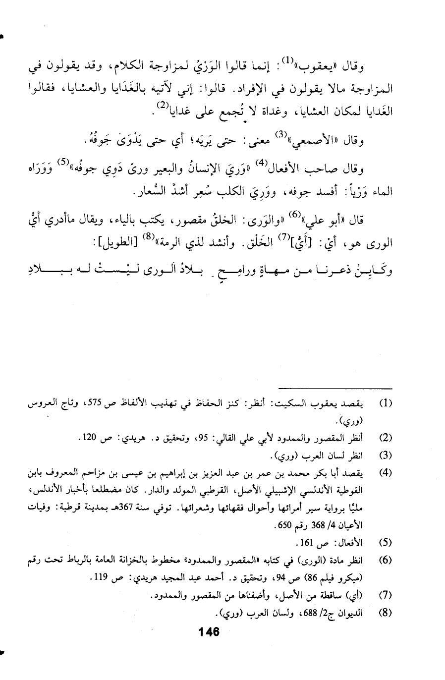 وقال يعقوب: إنما قالوا الوَرْيُ لمزاوجة الكلام، وقد يقولون في المزاوجة مالا يقولون في الإفراد.